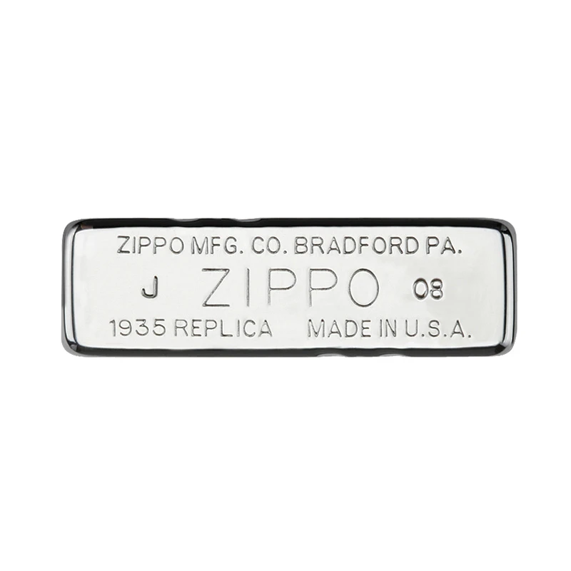 The 1935 Replica Zippo lighters offers a piece of lighter heritage. The three barrel outside hinge joins the lid and bottom (compared to the usual five barrel hinge) and the open hollow rivet secures the flint wheel to the inside unit. Meanwhile, the bright brushed chrome is finished with slashes in the top and bottom corners, and a unique stamp is displayed on the bottom. The engraving is made with a diamond-tipped machine cutter to achieve an elegant and enduring impression.