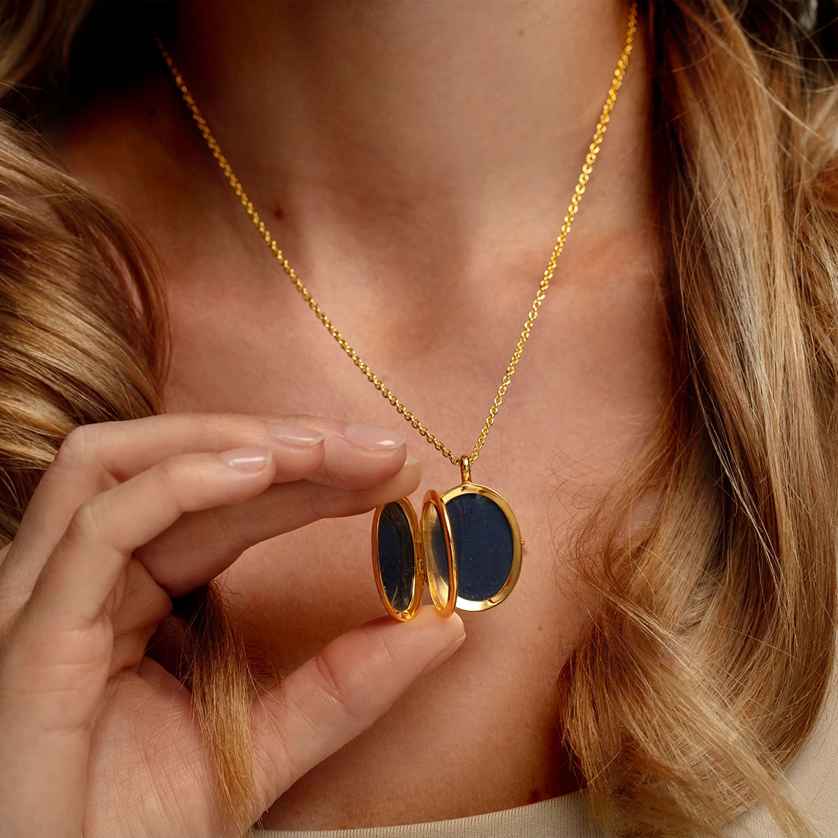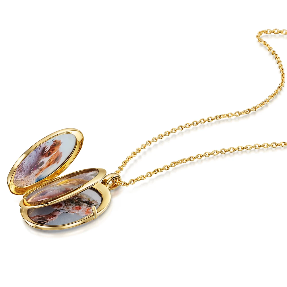 Large oval solid 925 sterling silver locket with 18K gold plating, accommodating four photo inserts. This beautiful locket from LOVELOX has been exquisitely designed so as to contain two extra photos without losing its wonderful slimline proportions. The perfectly crafted three-way hinge blends seamlessly into the silhouette of the locket, bringing a touch of surprise when discovering the four photos within.
