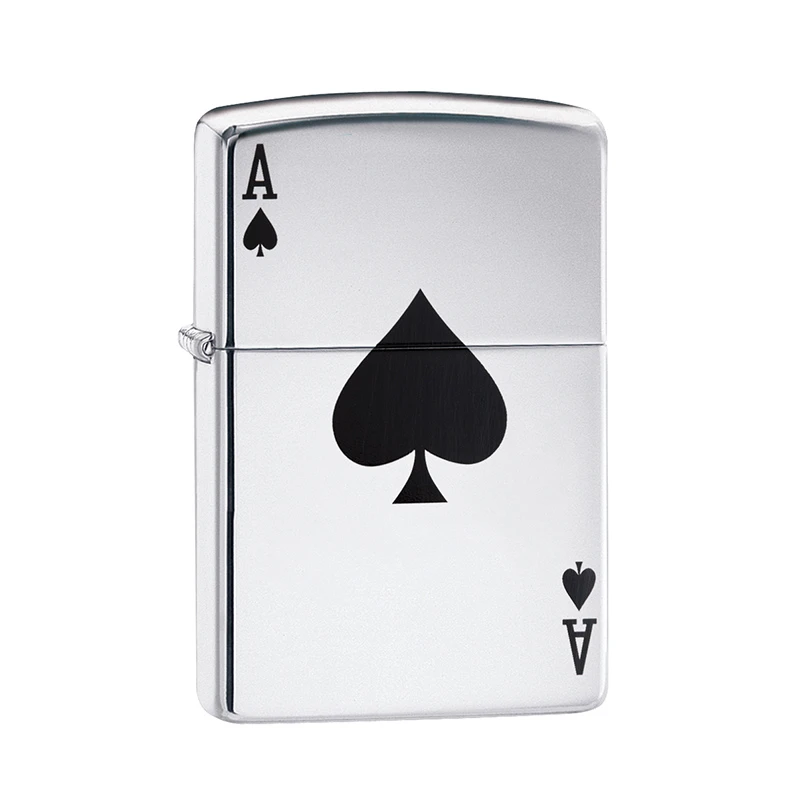 Zippo chrome lighter with Ace of Spades graphic displayed on front. The personalised lighter features flint action spark wheel and boasts Zippo’s innovative engineering capabilities which guarantee a piece of premium quality and lasting durability. An enduring favourite in the collection, this lighter is perfect for the card shark. The engraving is made with a diamond-tipped machine cutter to achieve an elegant and enduring impression.
