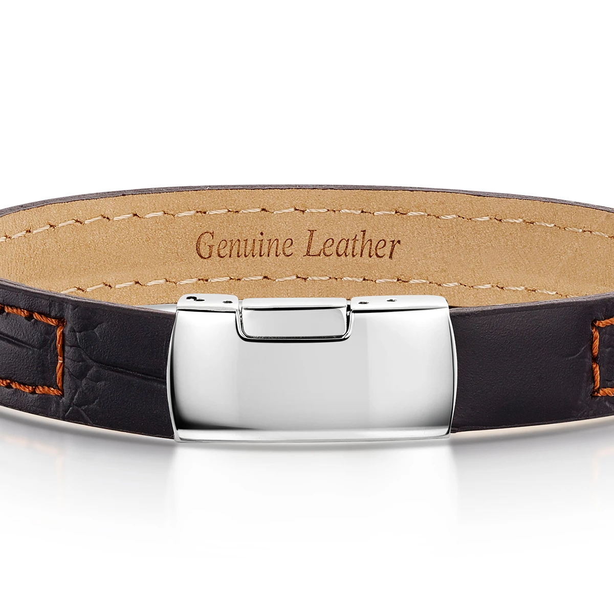 Men’s genuine leather bracelet in a contemporary black colour with contrasting orange stitching. Versatility meets individuality with its adjustable feature, catering to varying wrist sizes for a comfortable and tailored fit. What sets this bracelet apart is the option for personalisation. Engrave a significant name or date, turning this accessory into a cherished memento—a unique expression of personal style and sentiment.