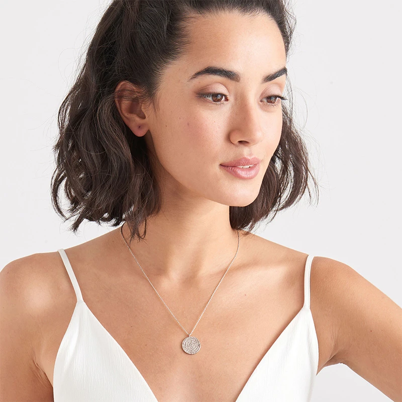 Solid sterling silver engraved necklace with ancient Minoan design from Ania Haie. This classically proportioned necklace is inspired by the Phaistos Disc, an ancient relic featuring secret hieroglyphic seals. Reinterpreted with a contemporary twist, the medallion draws inspiration from old coins of ancient trade routes, being beautiful reminders of how travel and exploration shaped our world. The engraving is made on the reverse of the pendant with the finest quality diamond-tipped cutters.