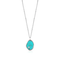 Rhodium plated solid sterling silver engraved necklace with sliced turquoise stone from Ania Haie. Instantly dress up any look with this statement droplet chain silver necklace with a stunning centrepiece stone. Adding something truly special to a minimal silver chain necklace, with a chunky turquoise stone detail complete with a cubic zirconia finishing touch. Add a unique touch by personalising the necklace with the recipients initials, name or special date. The engraving is made on the reverse of the pendant with the finest quality diamond-tipped cutters.