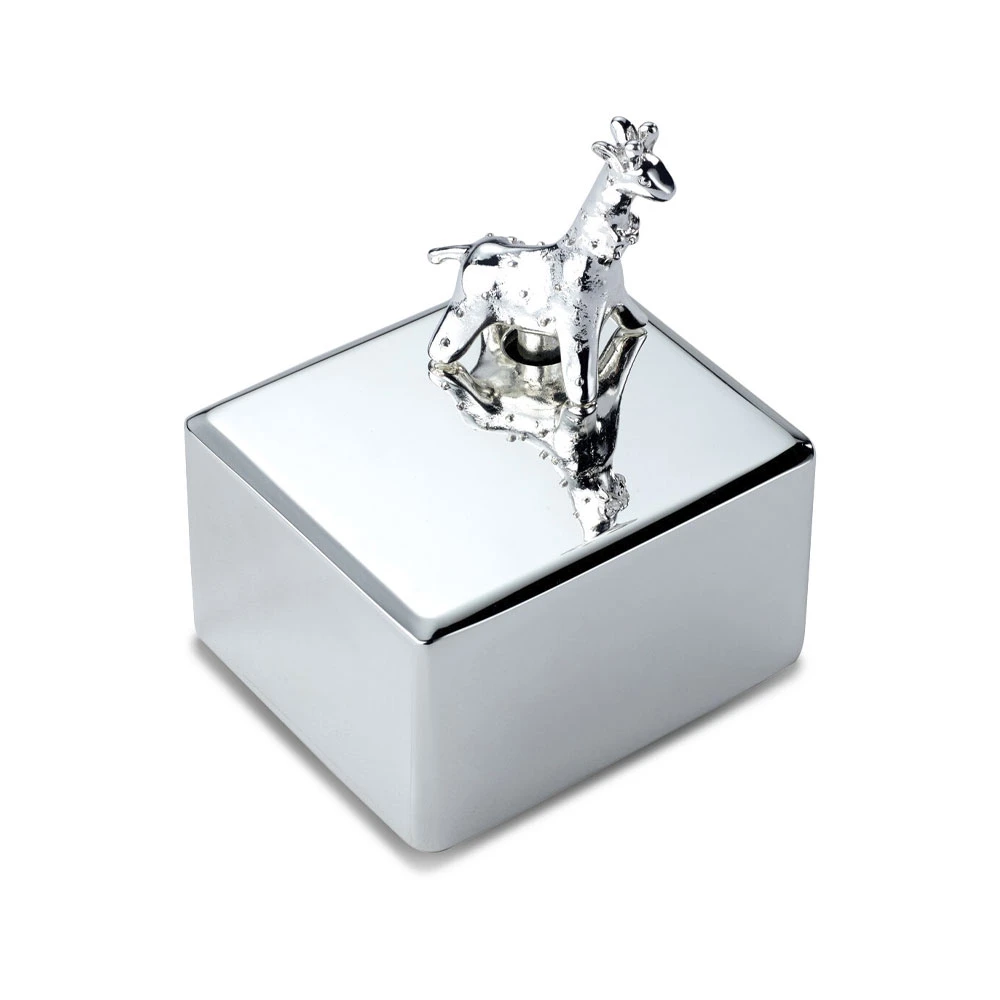 Presenting the Silver Plated Giraffe Music Box by Arthur Price. This exquisite piece, crafted in silver plating, is personalised with your heartfelt message, making it a truly unique and sentimental gift. With a gentle twist, the melody plays, accompanied by the enchanting sight of a miniature rotating giraffe. Packaged in a gift box, adorned with Arthur Priceโs emblem, this music box is not just a present; itโs a timeless treasure that adds a touch of sophistication to any occasion or decor.