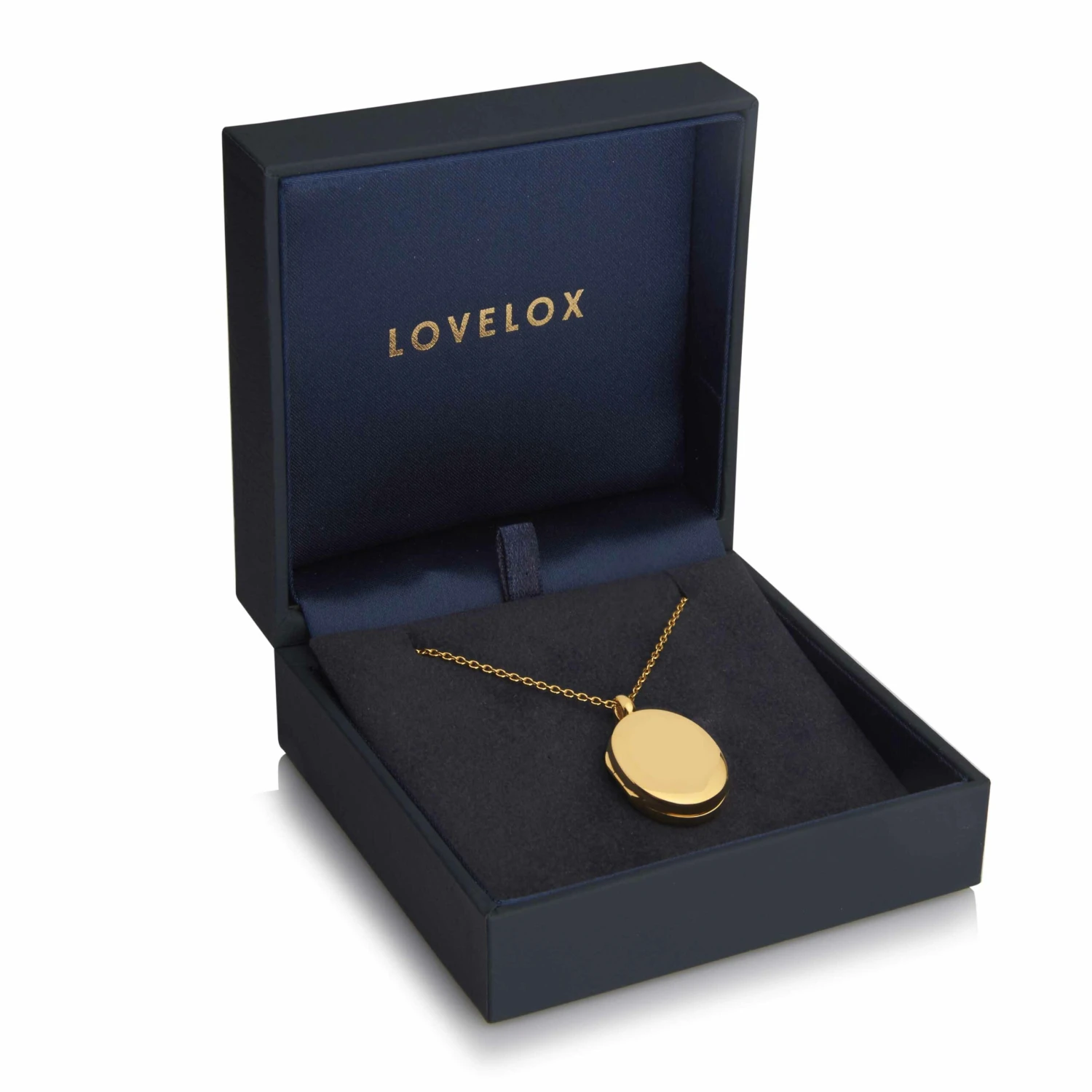 The personalised oval gold birth flower locket measures 18mm in width at the widest part, and 24mm in height. The solid silver chain with gold plating offers an adjustable length of either 16 or 18 inches.