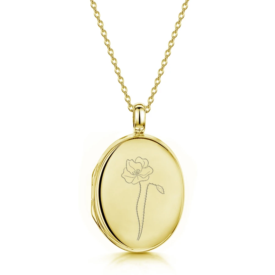 Large oval locket made in solid 925 sterling silver and plated with 18k gold, featuring one of 12 birth flowers. This truly exquisite item seamlessly incorporates the flow of the hinge into the body of the locket, and the interior has space for a sizeable photo within each side. With the engraving made with the highest quality diamond-tipped cutters, receiving the engraved gift makes for a very special moment.