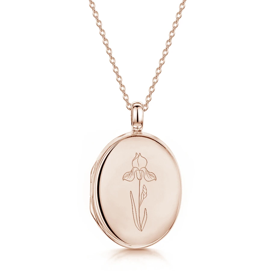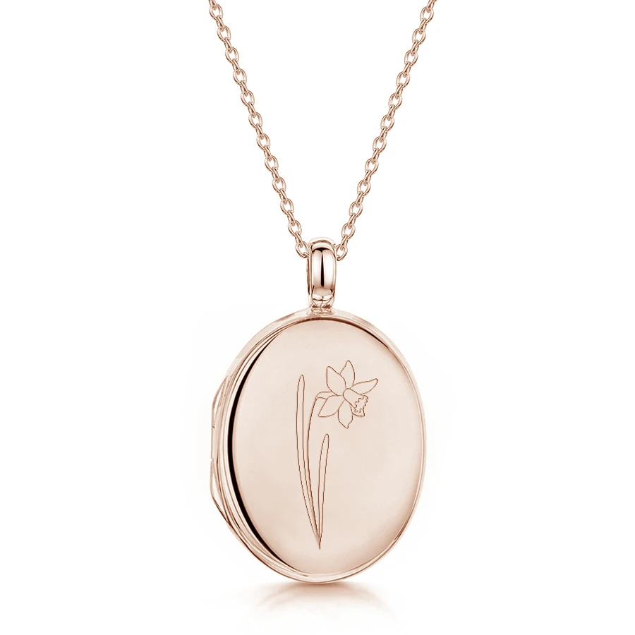 Large oval locket made in solid 925 sterling silver with beautiful 18k rose gold plating, featuring one of 12 birth flowers. This truly exquisite item seamlessly incorporates the flow of the hinge into the body of the locket, and the interior has space for a sizeable photo within each side. With the engraving made with the highest quality diamond-tipped cutters, receiving the engraved gift makes for a very special moment.