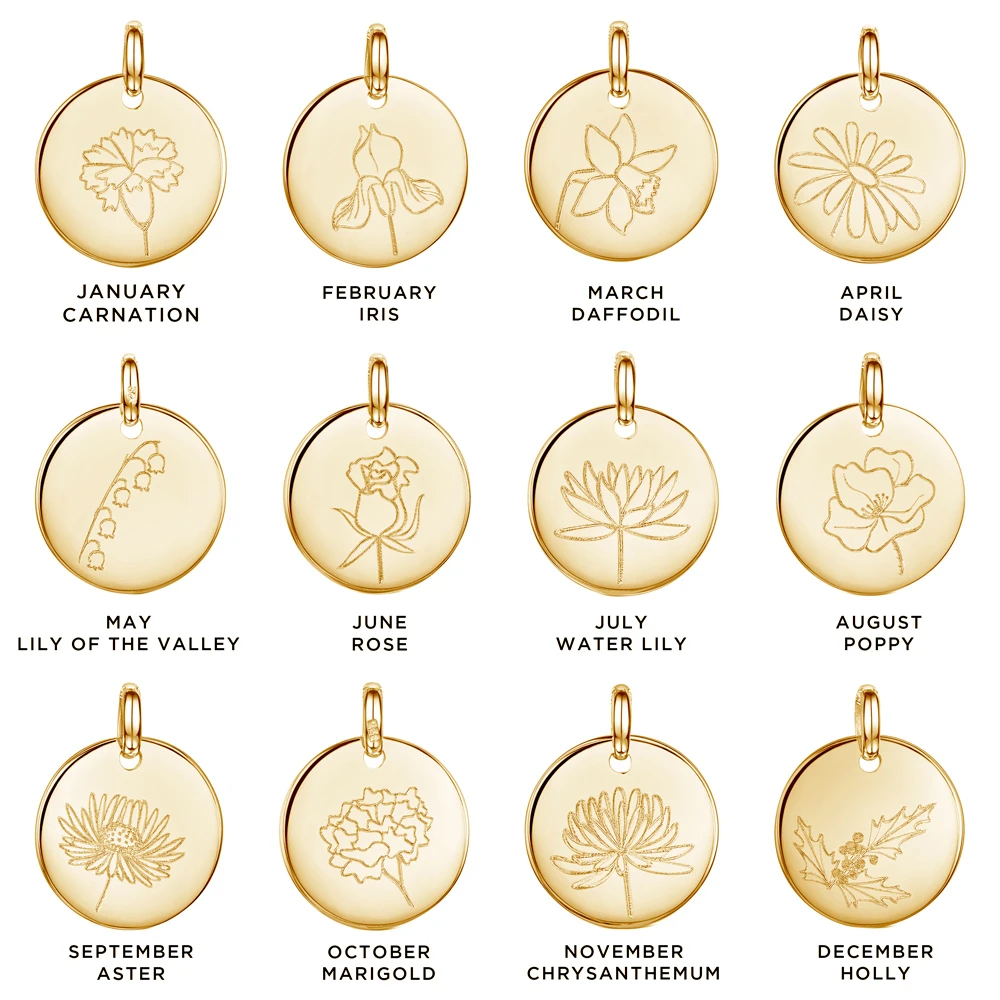 The gold Birth Flower pendant measures 15mm in diameter and two lengths of chain are available.