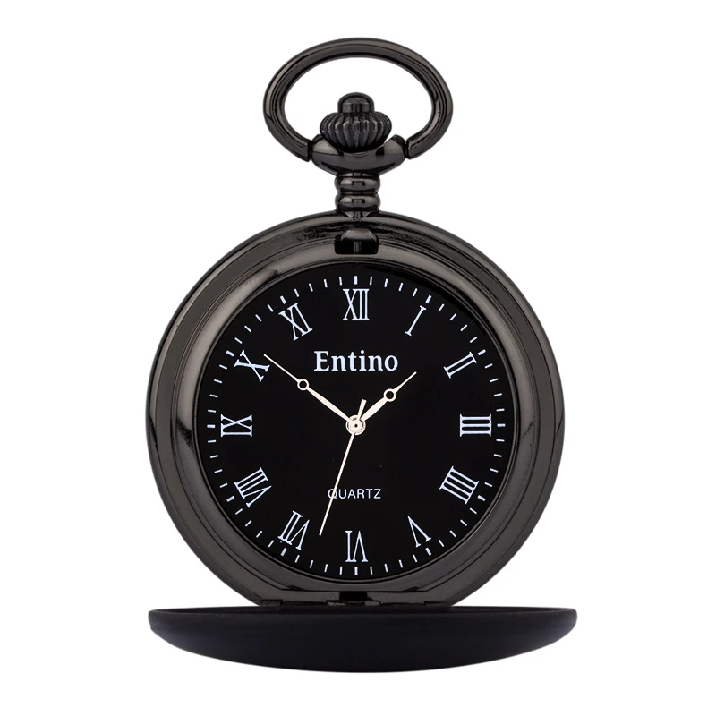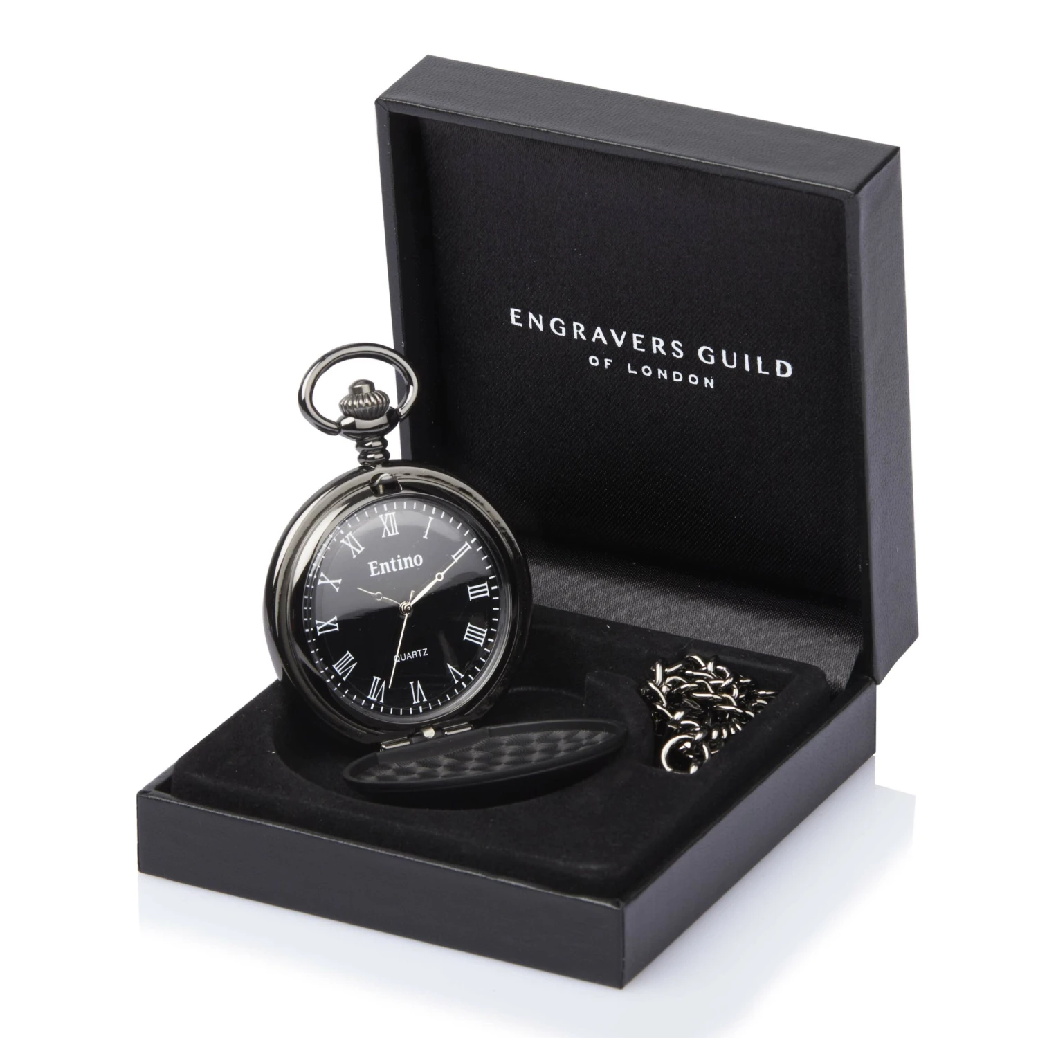 Matt black personalised pocket watch. This contemporary take on the traditional pocket watch offers a modern timepiece full of style and poise. The matt surface is engraved to reveal the shine of the metal beneath, brilliantly showcasing the personal message. The black theme is continued on the dial, with while Roman numerals offset on the black face. The personalised pocket watch is presented in signature packaging from Engravers Guild of London.