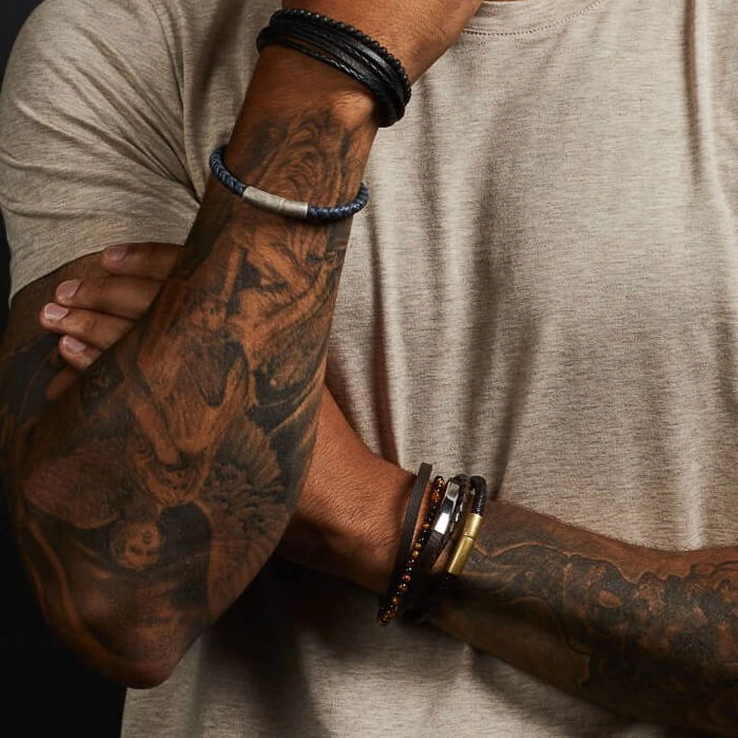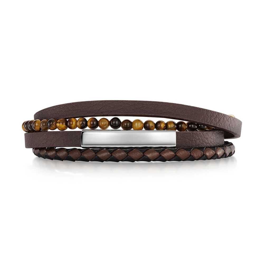 Mens personalised bracelet featuring 3 recycled genuine leather straps, complemented by a row of Tiger’s Eye natural beads. Tiger’s Eye is known to represent awareness and personal strength. The steel name plate provides the opportunity for personalisation, allowing for the engraving of a name or special message. With its convenient clip strap, this bracelet offers ease of wear and a secure fit, making it a timeless accessory for any occasion.
