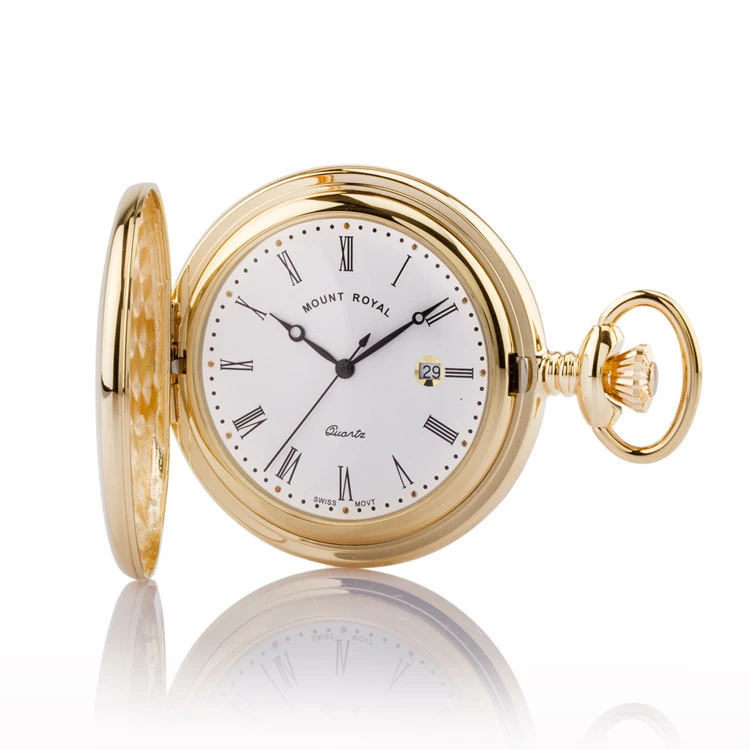 Classic gold plated personalised pocket watch from the Mount Royal collection. This beautiful timepiece is crafted to exceptional standards and is designed to last for generations. Featuring a calendar display and clean white dial, the pocket watch offers a timeless aesthetic which delights in its simplicity. With a personal message engraved with traditional diamond-tipped cutters, the item makes for a very special gift that is guaranteed to leave a lasting impression.