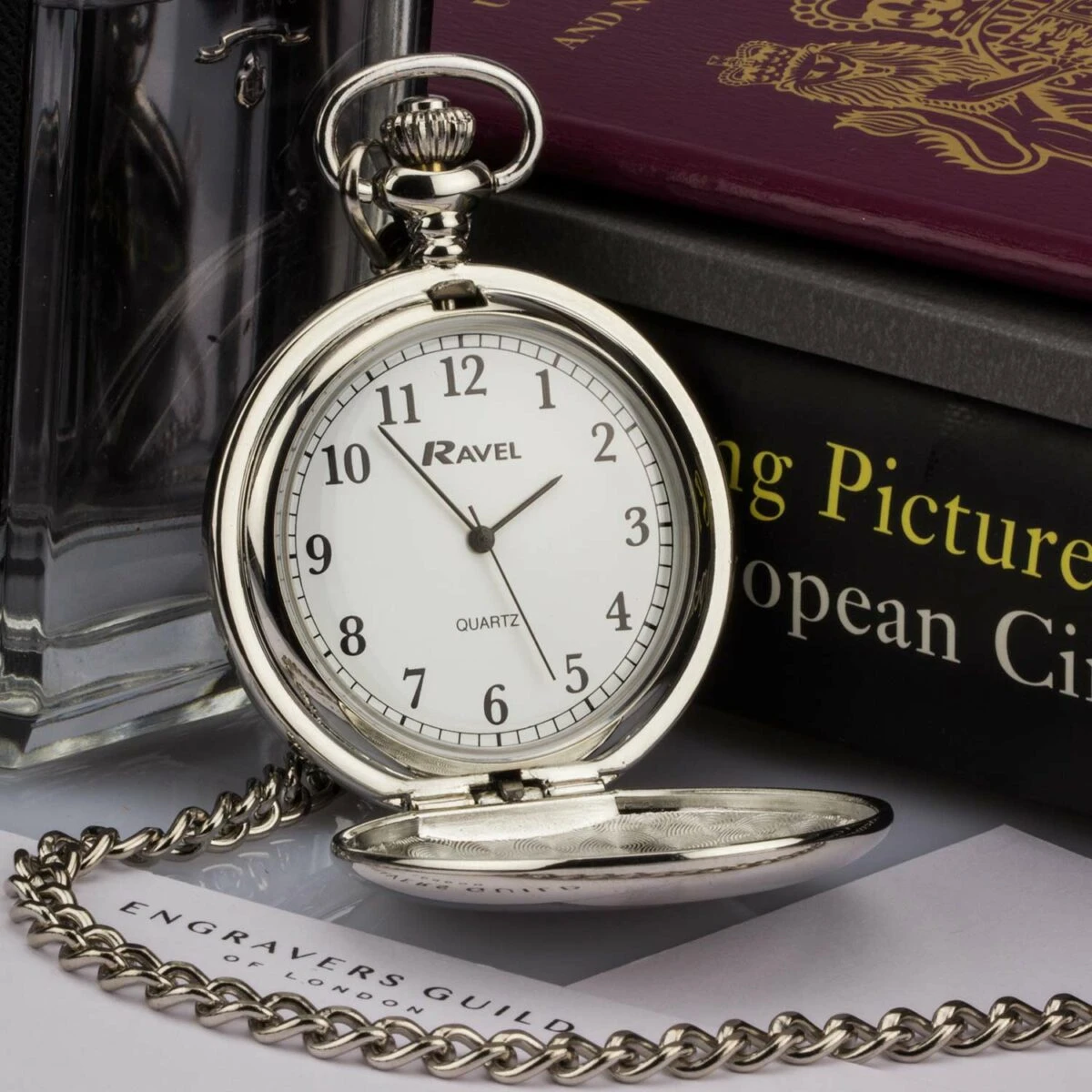 Classic silver personalisedΒ pocket watch featuring clean white face and numbers on dial. This classic timepiece with Quartz movement is an elegant gift which can be personalised with up to four lines of precision engraving on the outside of the hinged lid. Every gift from Engravers Guild of London is finished to the highest standards and presented in our signature packaging.