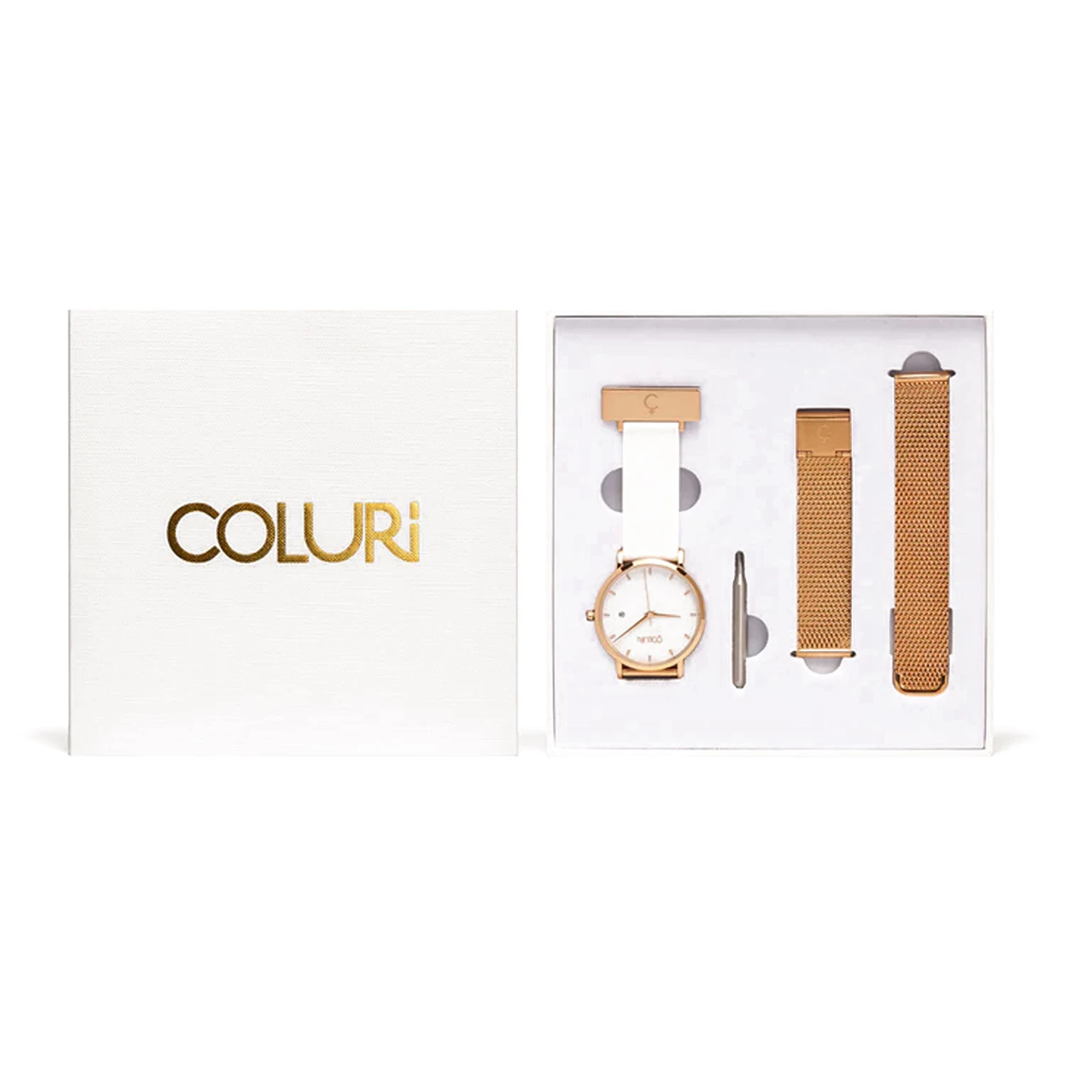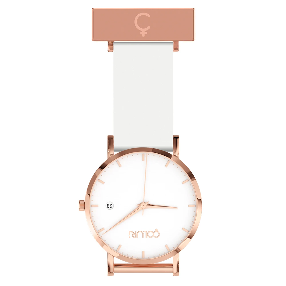 Rose gold silicone fob nurses watch with white dial from Coluri that transforms into a rose gold wrist watch. These 2-IN-1 luxury nurse watches support women across the world and can be transformed into classic wristwatches when off-duty, making them the perfect gift for nurses. Simply change your band for work or play using the innovative quick-release feature. Their signature “INSPIRE” ethos is discreetly engraved into the Rose Gold plated case and celebrates nurses who inspire our lives.