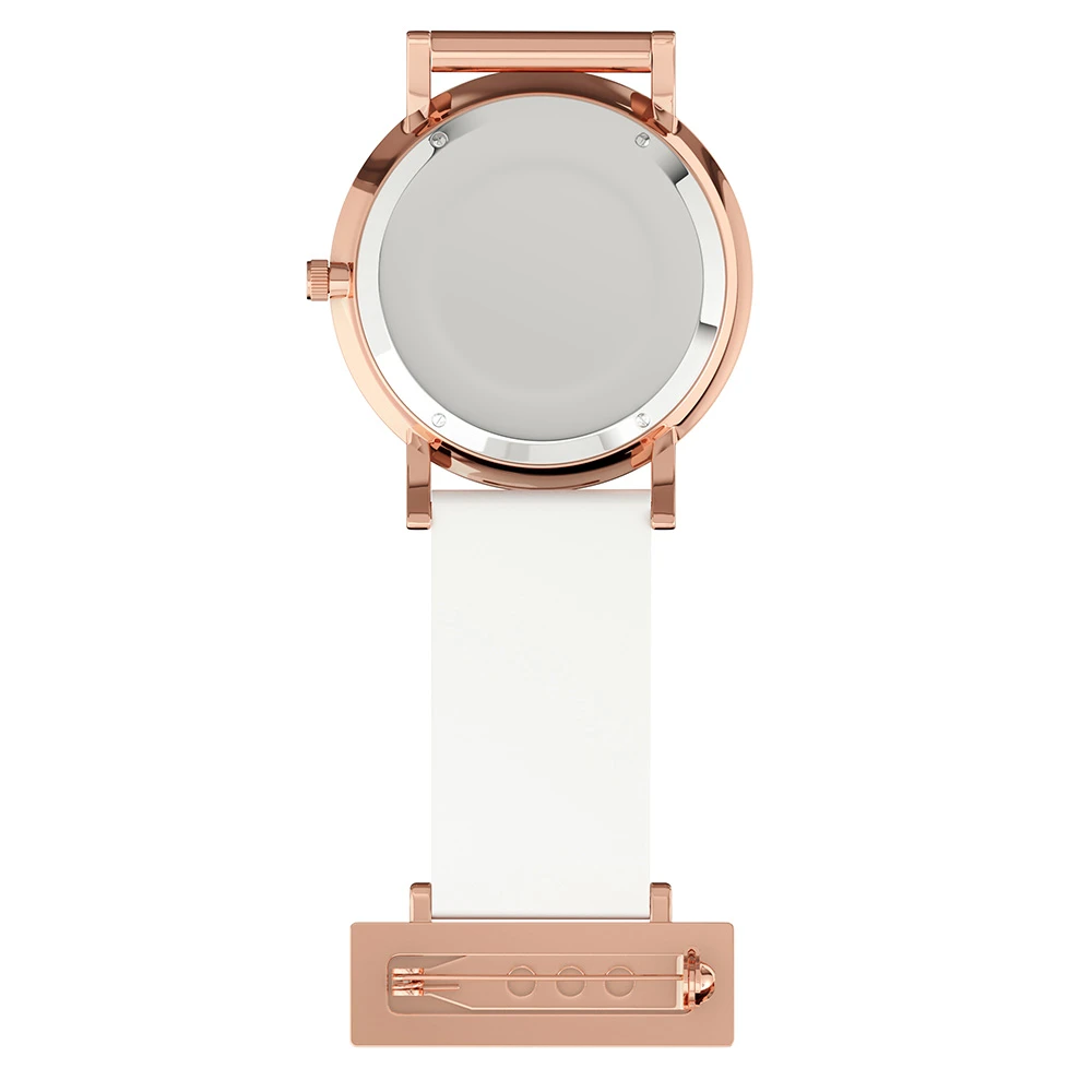 Rose gold silicone fob nurses watch with white dial from Coluri, a social brand created to celebrate the remarkable women who inspire our world. The high quality, bold and colourful watches are designed by women, for women and are distinguished by a host of special touches. Their signature “INSPIRE” motto is discreetly stamped into the case of the watch, the clean white dial features a date function and the sapphire glass is scratch resistant.