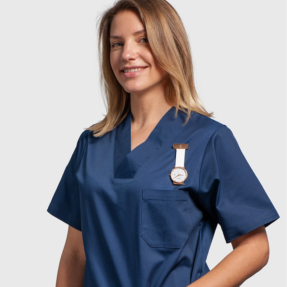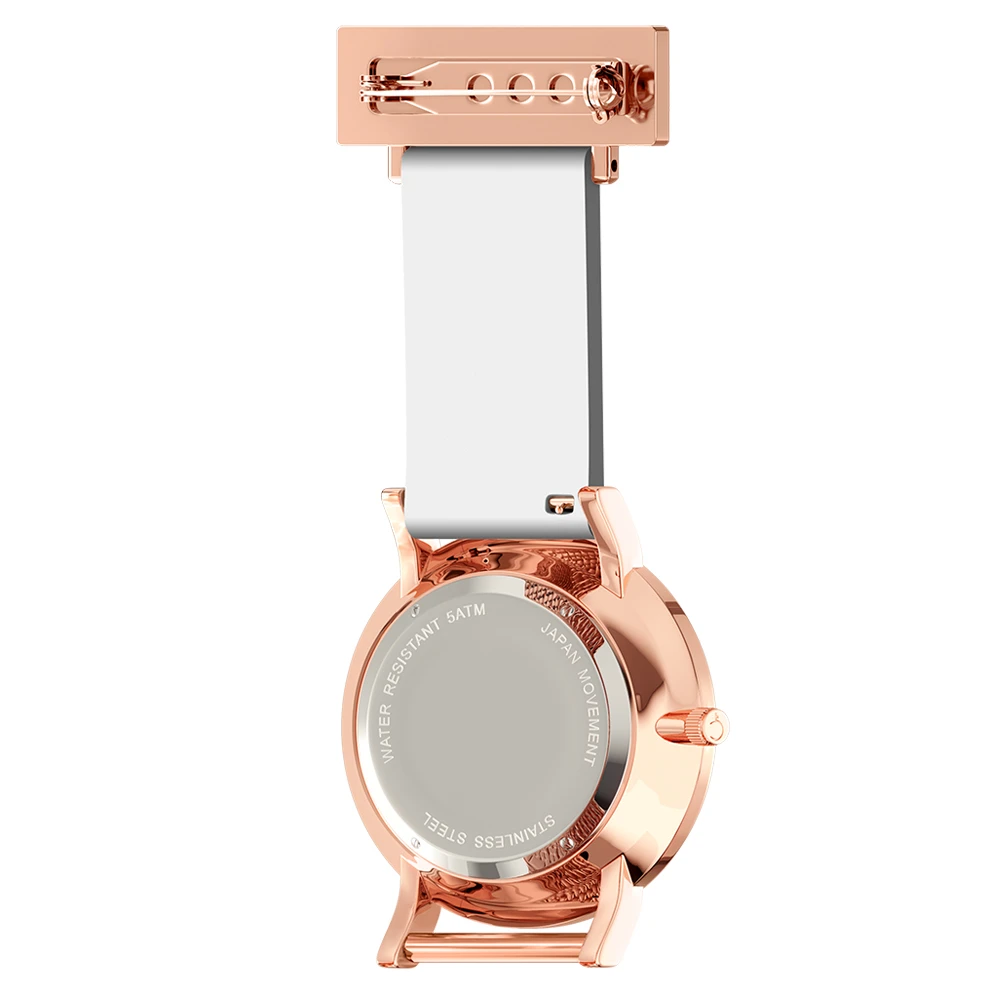 The rose gold nurse fob is 36mm in diameter and the leather strap measures 45mm in length. It houses a precision Miyota Japanese movement and is water resistant to 5 ATM.