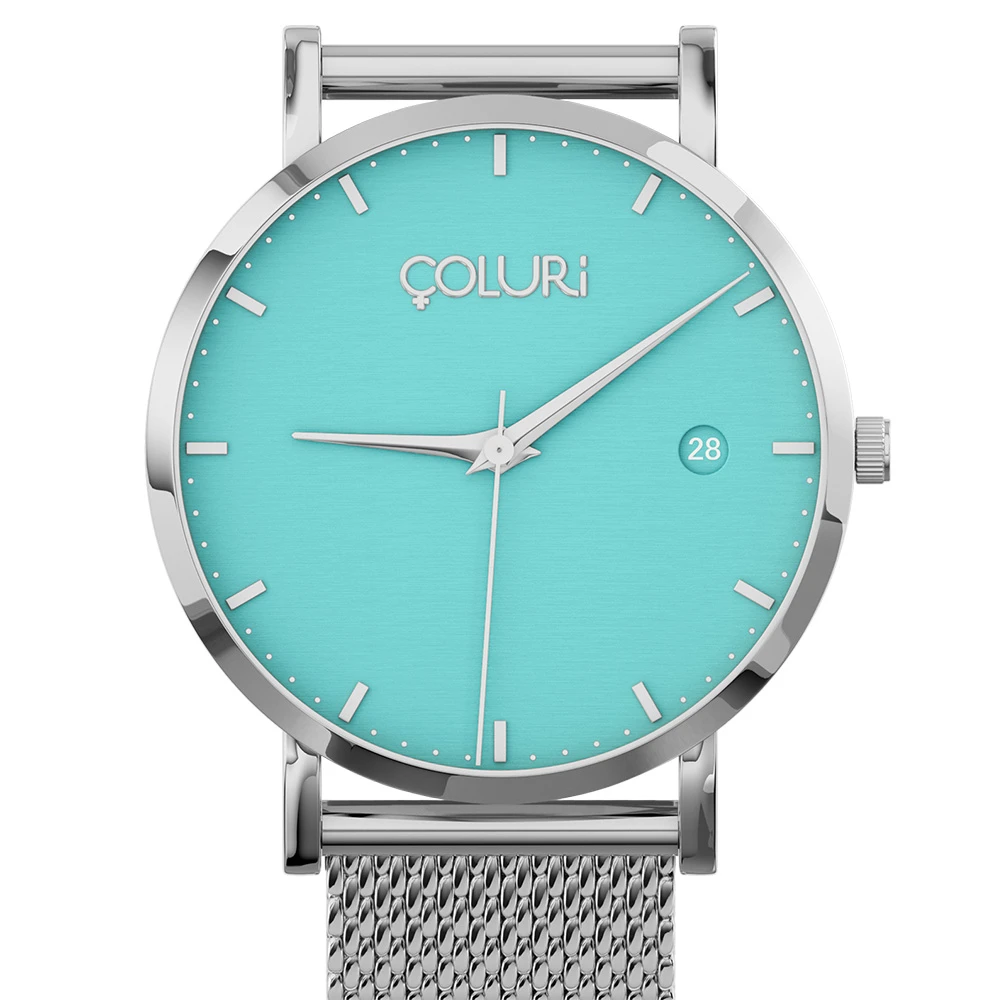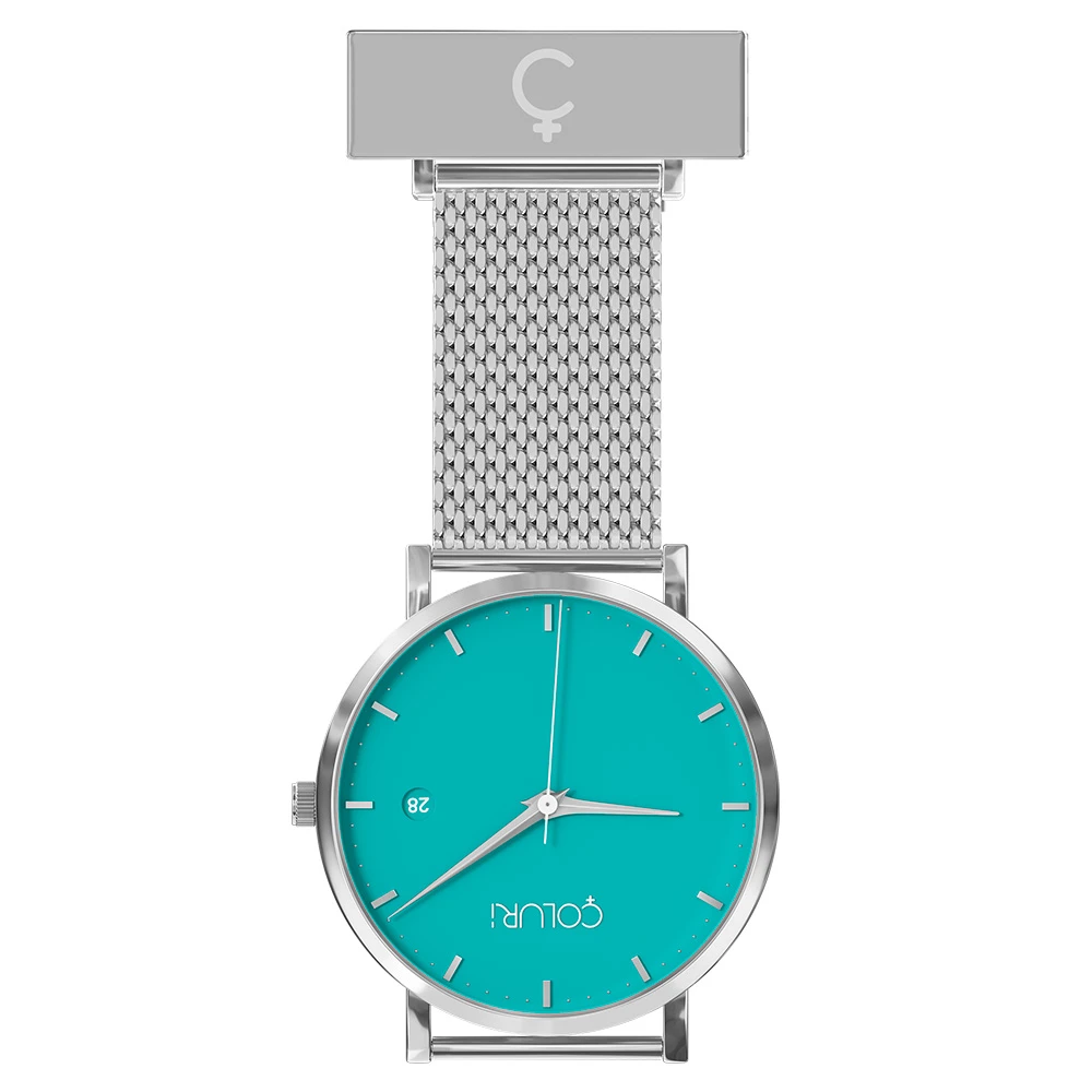 Silver mesh strap nurse watch with green dial from Coluri, a social brand created to celebrate the remarkable women who inspire our world. The high quality, bold and colourful watches are designed by women, for women and are distinguished by a host of special touches. Their signature “INSPIRE” motto is discreetly stamped into the case of the watch, the clean green dial features a date function and the sapphire glass is scratch resistant.