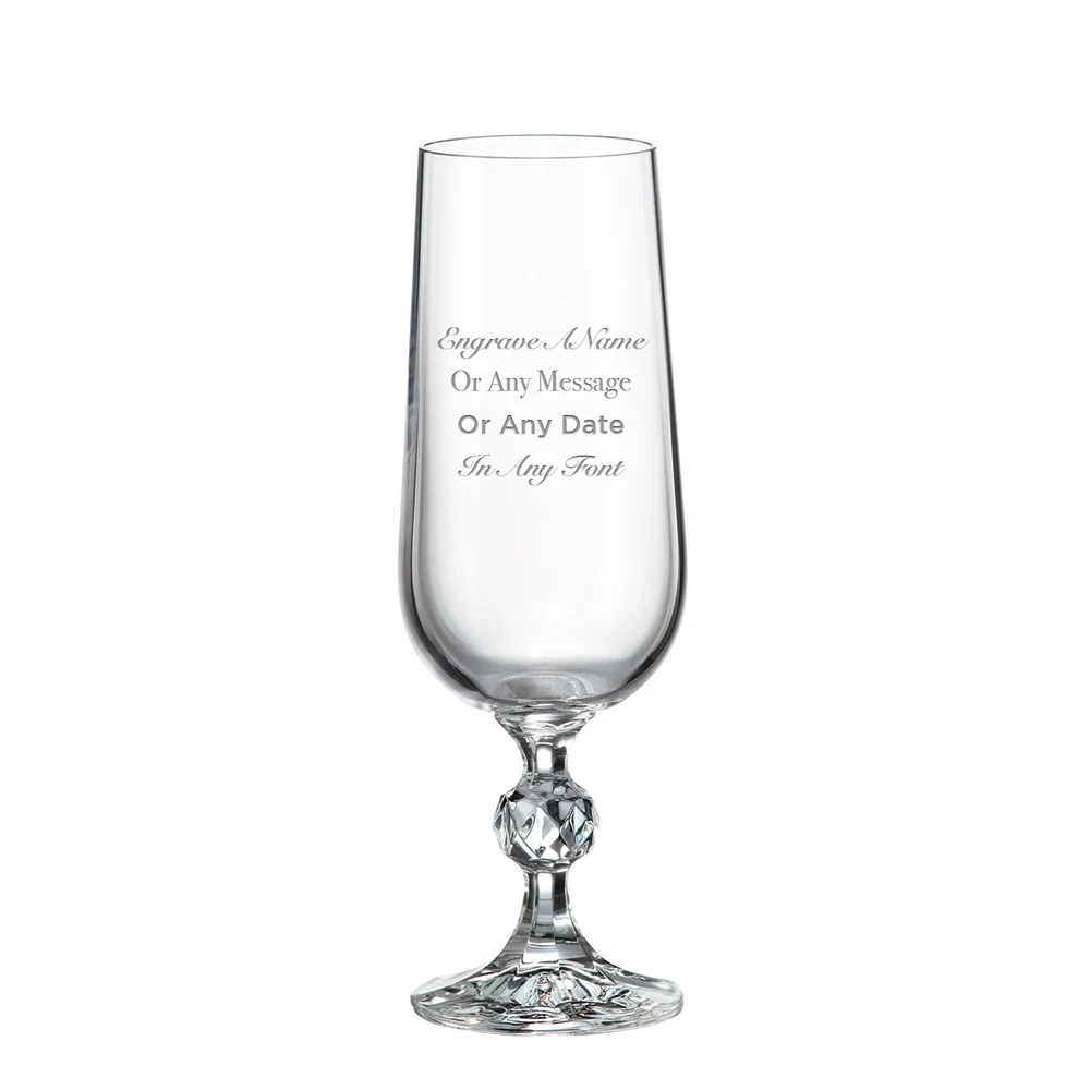 Crystalite champagne glass featuring facetted stem. Elegant and sophisticated, this traditional champagne flute is a favourite for those who favour a touch of distinction. Perfect for everyday use or for special occasions, precision laser engraving cuts a beautiful impression making the gift personal, and even more special.