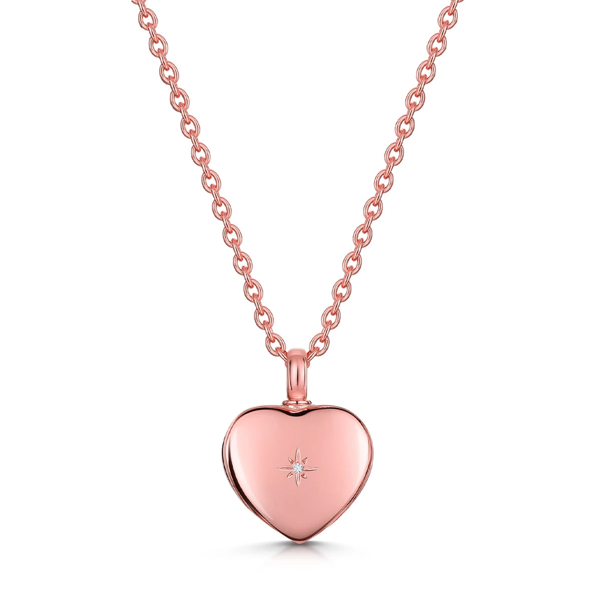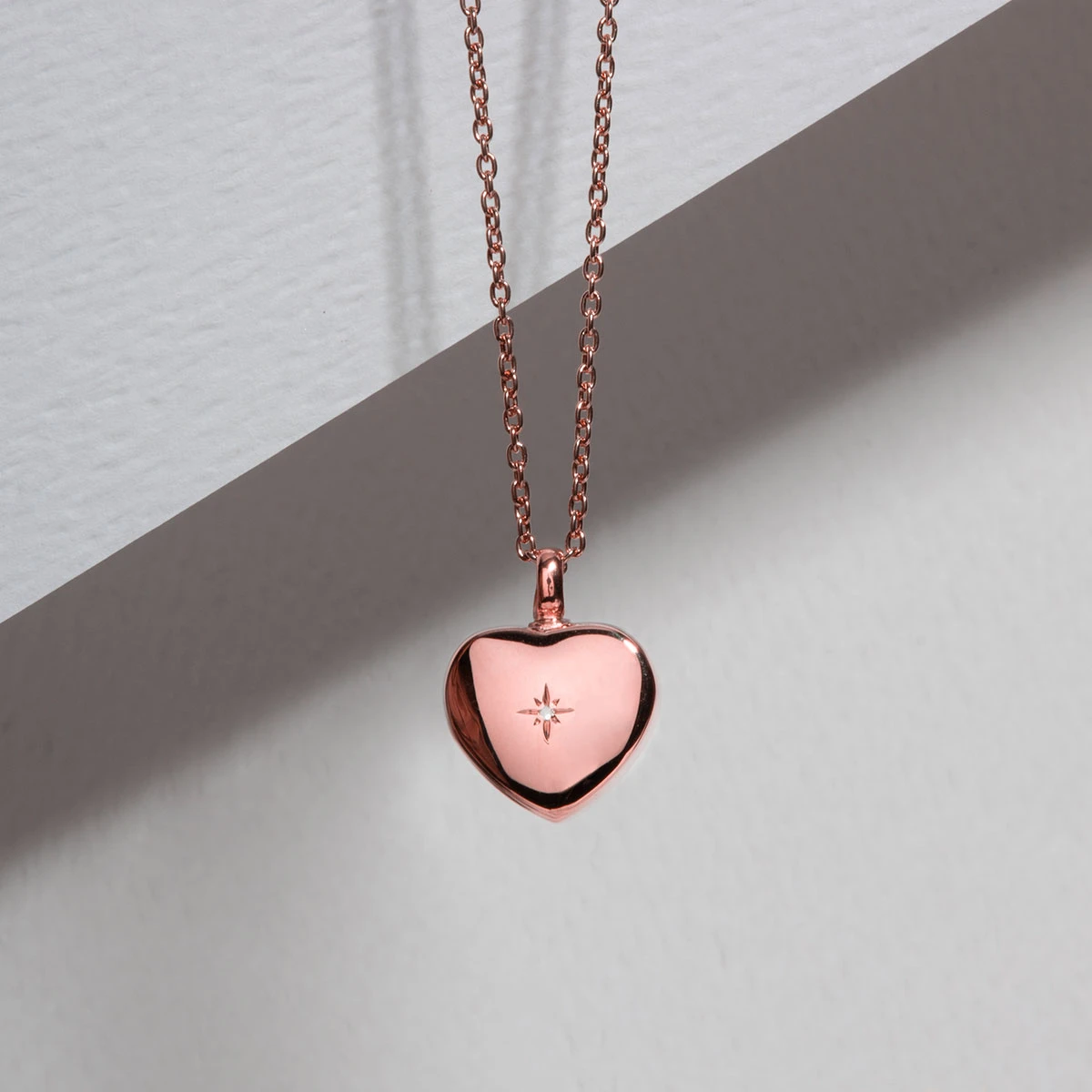 Crafted from 925 sterling silver and plated with 18K rose gold, this LOVELOX urn and chain features a stunning diamond in the centre of a heart shaped pendant, serving as a timeless tribute to those we hold closest to our hearts. Effortlessly access the discreet urn with its concealed screw-top mechanism – simply twist the bail until it opens. Complete with a convenient funnel and poker, insertion of precious ashes is an easy process.