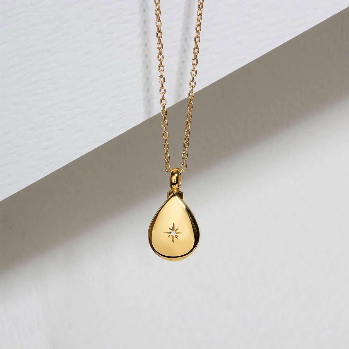 Crafted from 925 sterling silver and plated with 18K gold, this LOVELOX urn and chain features a diamond in the centre of a teardrop pendant. This urn elegantly encapsulates cherished memories, offering solace to those who hold it close. Effortlessly access the discreet urn with its concealed screw-top mechanism – simply twist the bail until it opens. Complete with a convenient funnel and poker, insertion of precious ashes is an easy process.