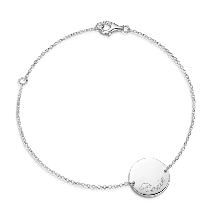 Solid silver disc tag on sterling silver chain from MYRI London. This beautiful personalised bracelet is a classic piece that should have a place in every jewellery collection. The silver chain is finely balanced to be substantial yet delicate, and the circular tag is the perfect stage to showcase an exquisite personalised engraving. All engraving is carried out with the finest diamond-tipped cutters to create a stunning piece that is designed to last indefinitely and grow with the person.