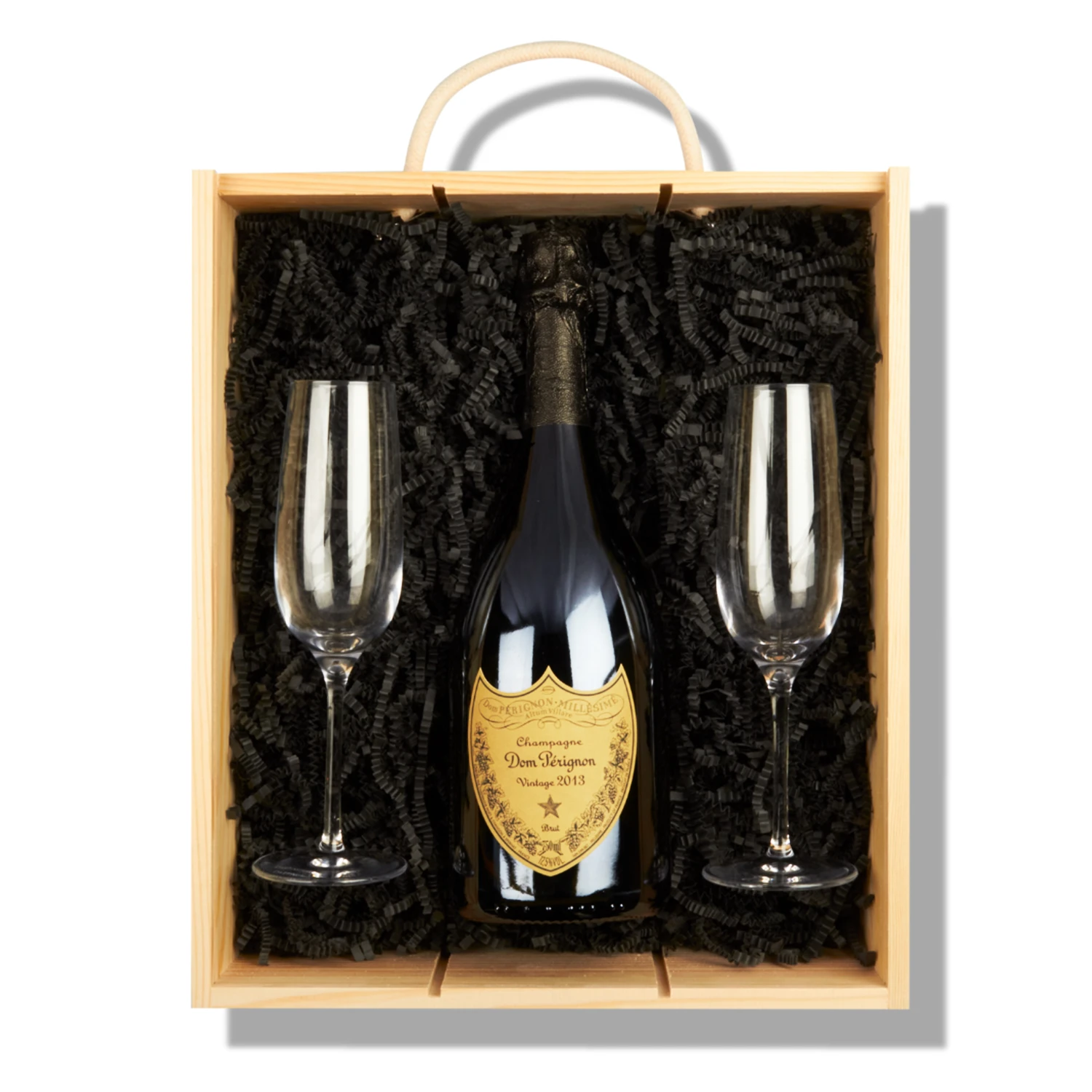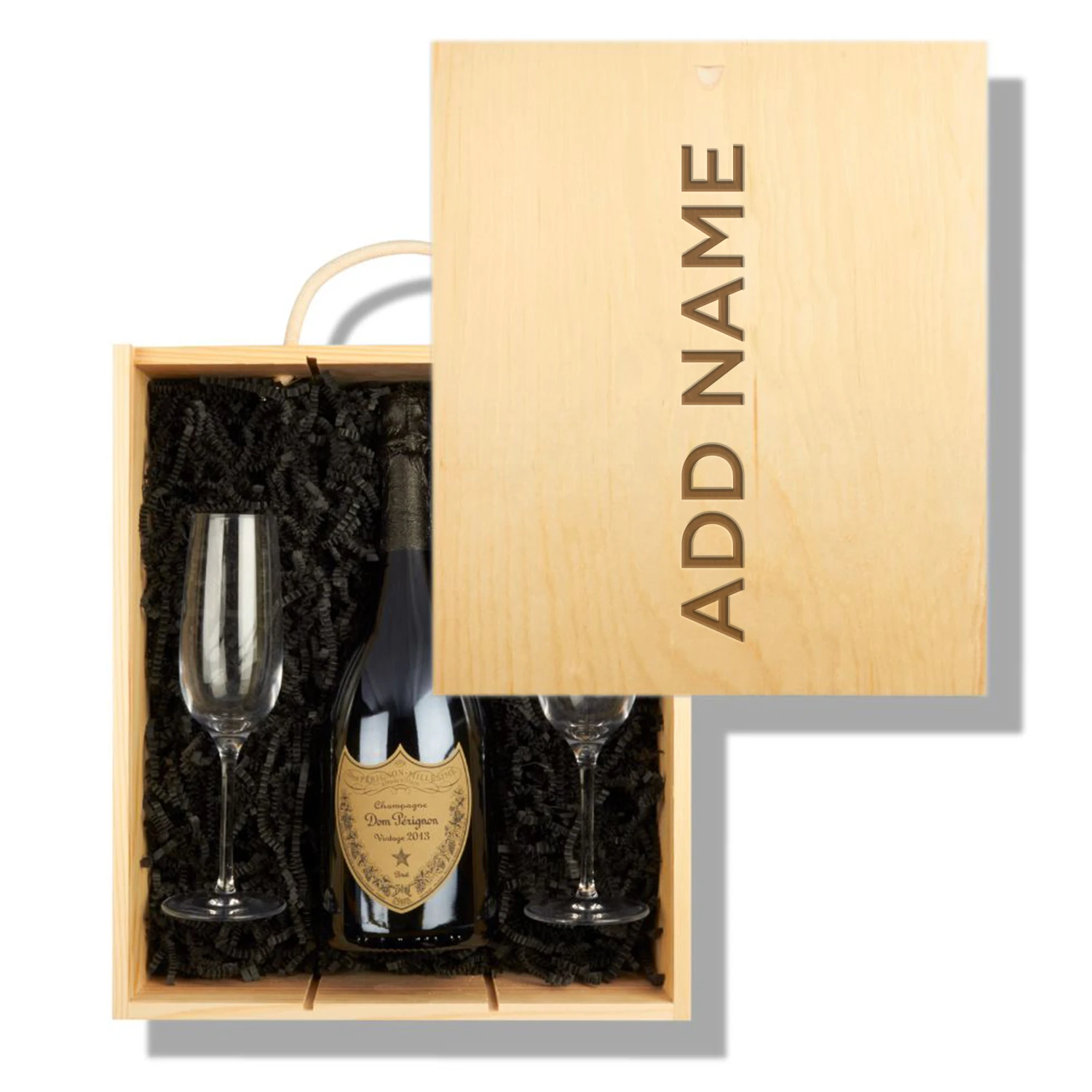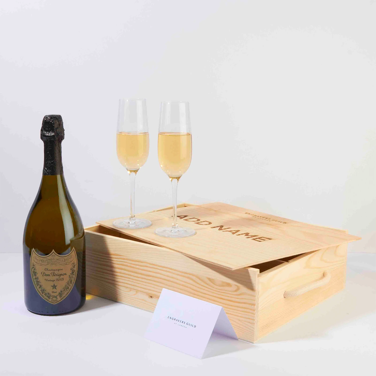 Your wooden gift box includes: 2x Dartington Crystal personalised champagne flutes, 1x Dom Perignon Champagne (750ml), 1x wooden crate box