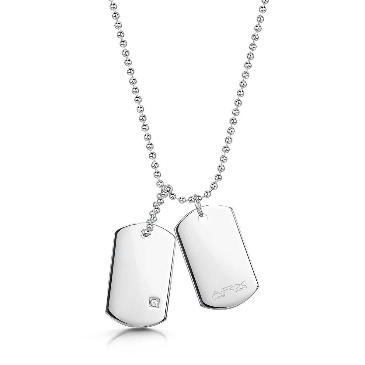 Both tags measure 18mm wide by 28mm high and is presented in Jos Von Arx packaging. The pendant hangs on an 20 inch chain.
