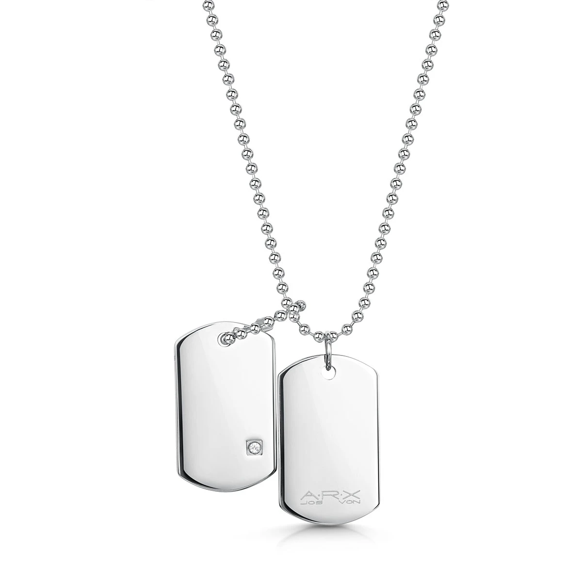 This doublde dog tag necklace is a striking accessory with a touch of sparkle that fuses style and personalisation. Crafted from high-quality steel, this necklace features two sleek dog tags, with one tag elegantly embedded with a small crystal on the front. Meticulously designed with attention to detail, these dog tags offer the perfect canvas for engraving a special message of your choice.
