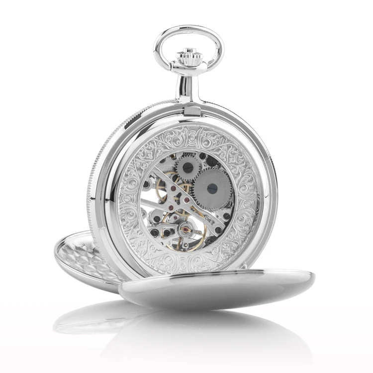 Double hunter skeleton pocket watch with silver chrome plating and mechanical movement from the Mount Royal collection. The classic styling of this timepiece offers handsome aesthetics with combine with precision craftsmanship to produce a pocket watch of exquisite poise. A 17 jewel movement which guarantees accurate time keeping can be viewed from front and back, and the polished case is the perfect stage for an engraved message.