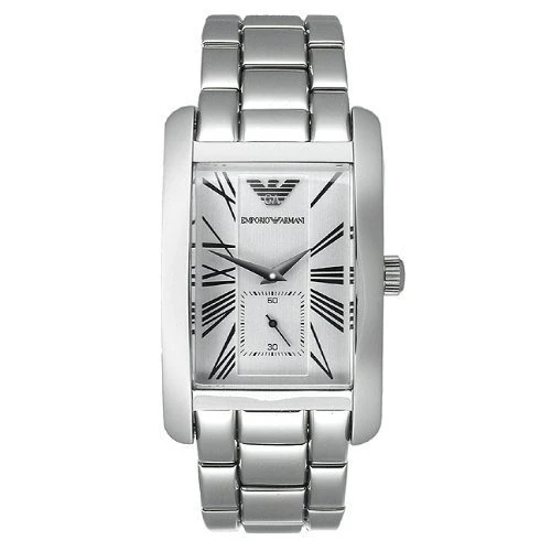 Classic, men’s designer watch with rectangular silver dial and black roman numerals from Emporio Armani, one of the world’s most respected fashion houses.