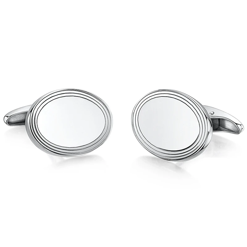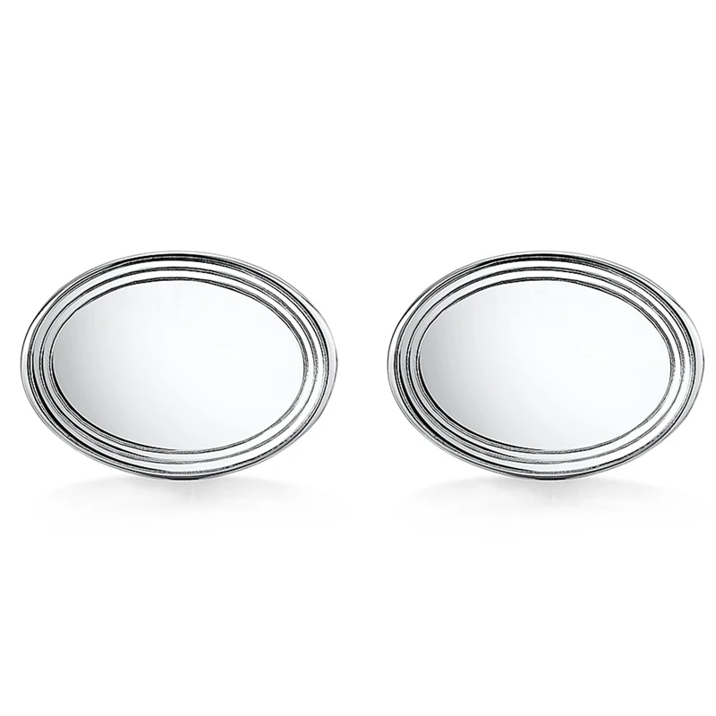 Engine turned solid silver personalised cufflinks for him from Clewley. This exquisite pair of engraved cufflinks are the most premium pair in the Engravers Guild collection and feature wonderful craftsmanship. Displaying poise and elegance, they offer a large engraving area framed by a simple embellishment of two concentric lines running around the circumference of the oval.