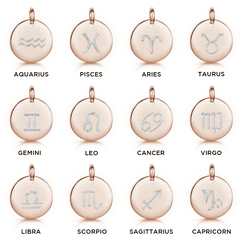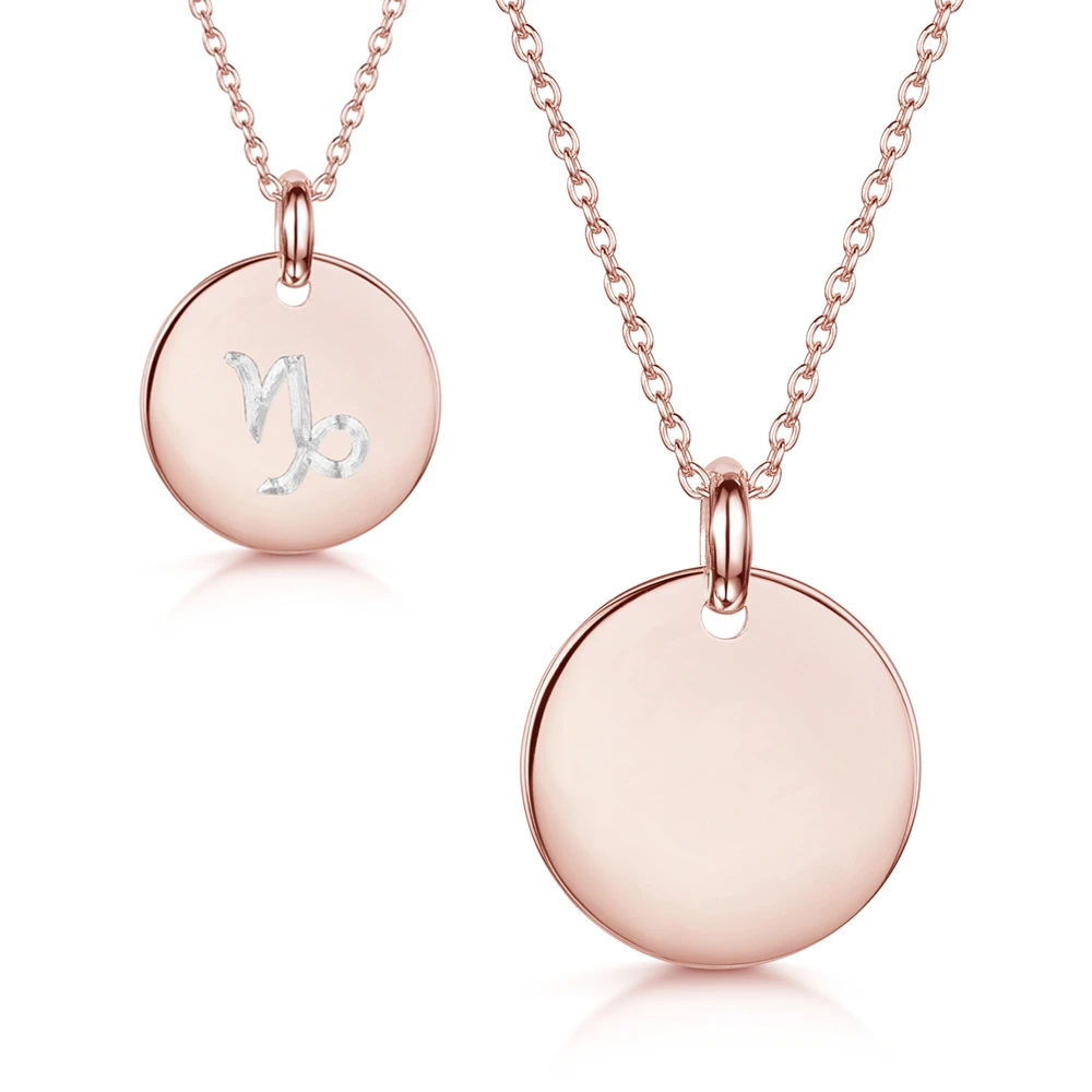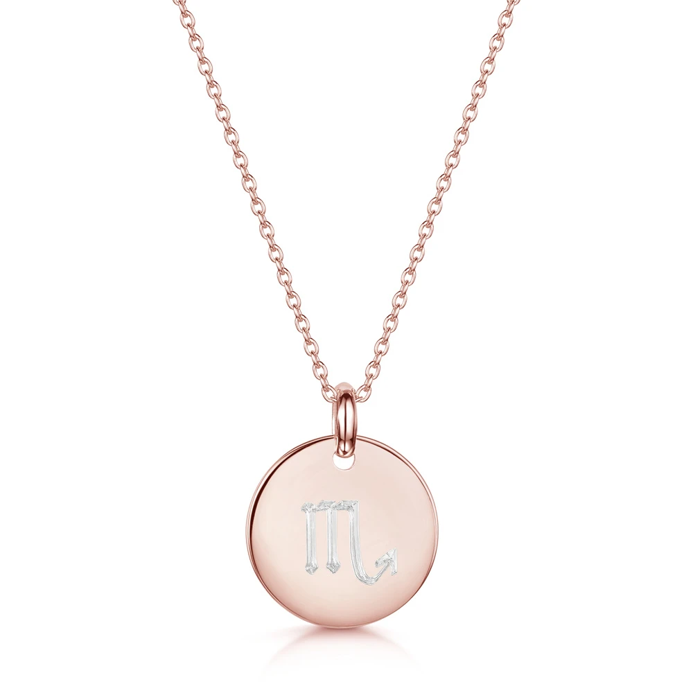 18K rose gold plate on solid silver pendant featuring one of the 12 Zodiac Constellations on the front and a personal engraved message on the reverse. This personalised necklace from MYRI London is a beautifully formed and exquisitely finished piece. A contemporary update on a timeless design, simply choose for the appropriate Zodiac to be engraved on the front and compose a custom message on the reverse. Intended to last a lifetime, the necklace is an enduring favourite in any jewellery collection. The piece is expertly finished with a traditional diamond-cut engraving for a wonderfully personal touch.