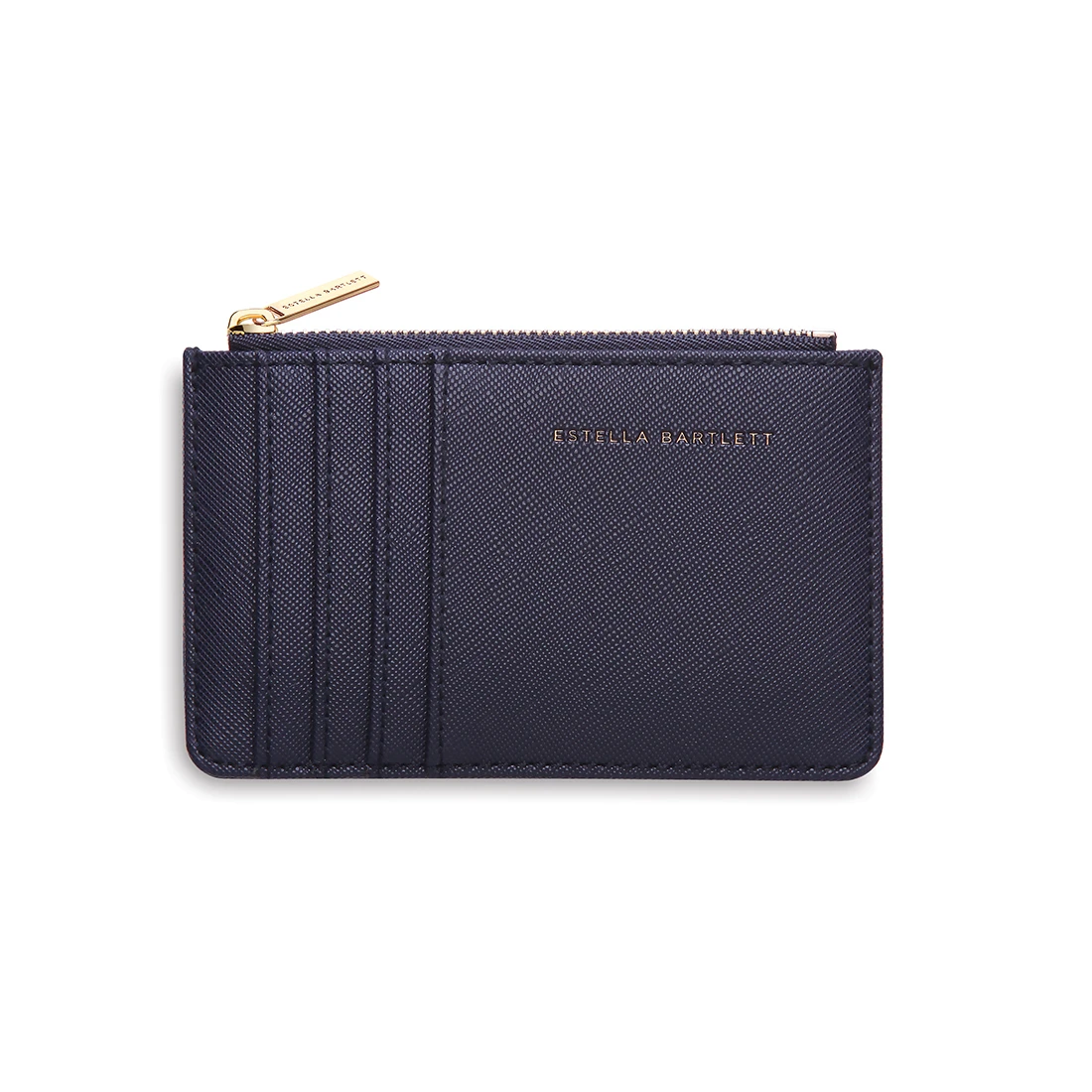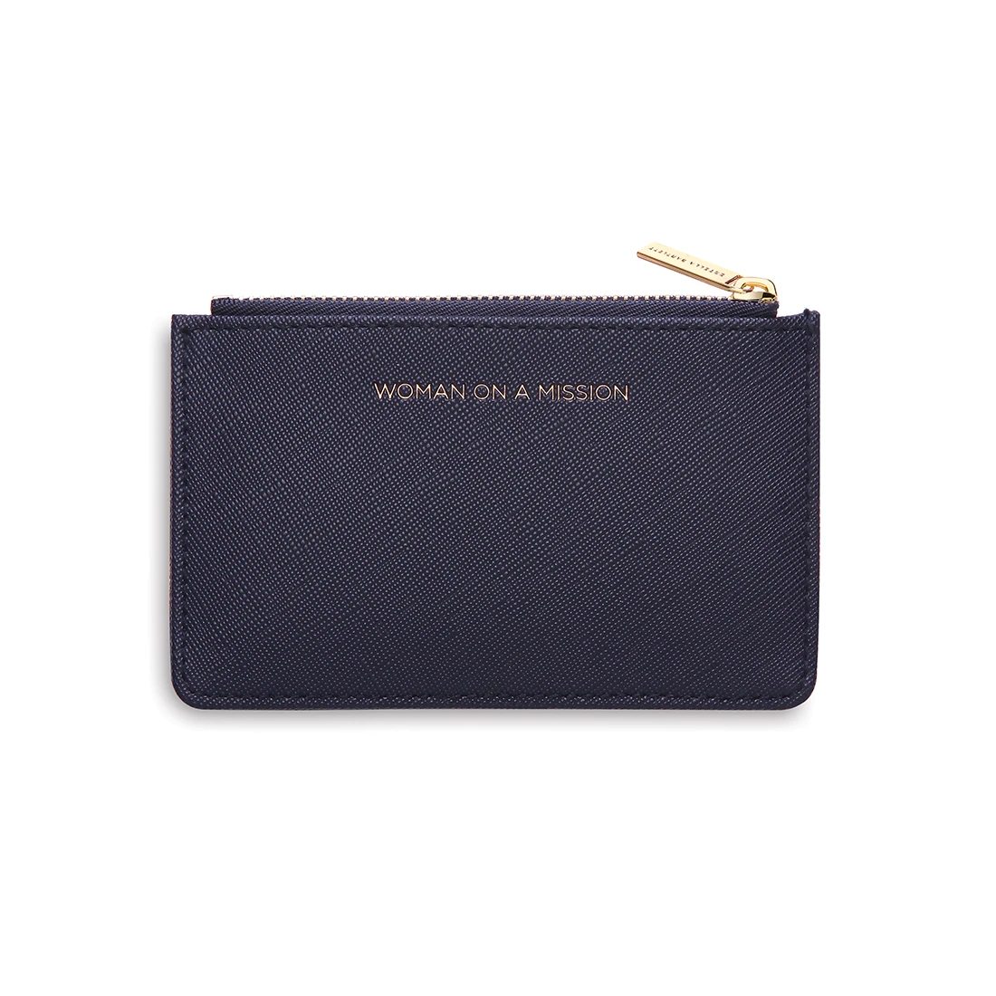 A slim purse with space for cards and coins in a gorgeous navy blue colour. This personalised purse makes the perfect practical accessory to keep organised, whilst keeping chic. A metal gold zip and four card compartments keeps your money safe at the same time as keeping compact. Made from faux leather, this purse also features a “WOMAN ON A MISSION” quote, along with initials embossed by Engravers Guild to make this purse extra special.