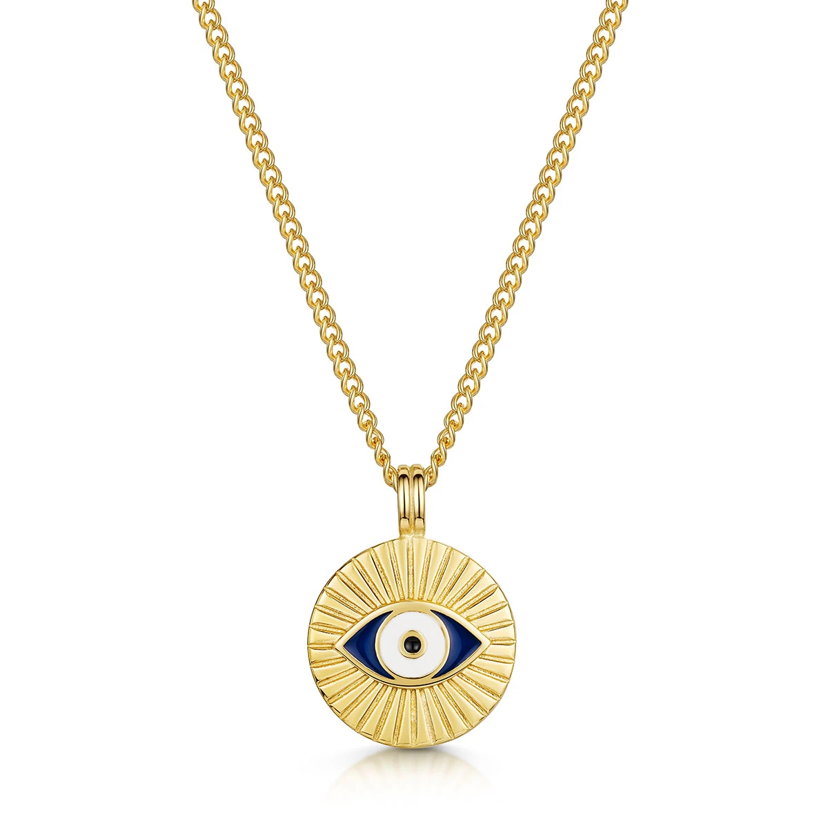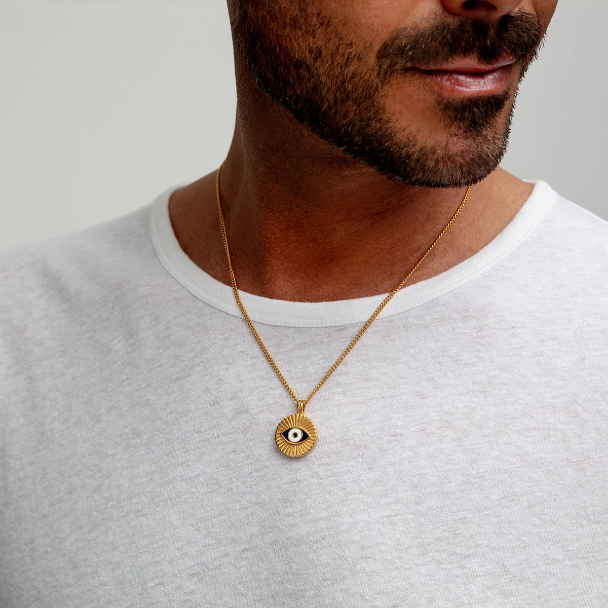 The circular pendant features the iconic Eye of Providence, symbolising wisdom and protection associated with good fortune.