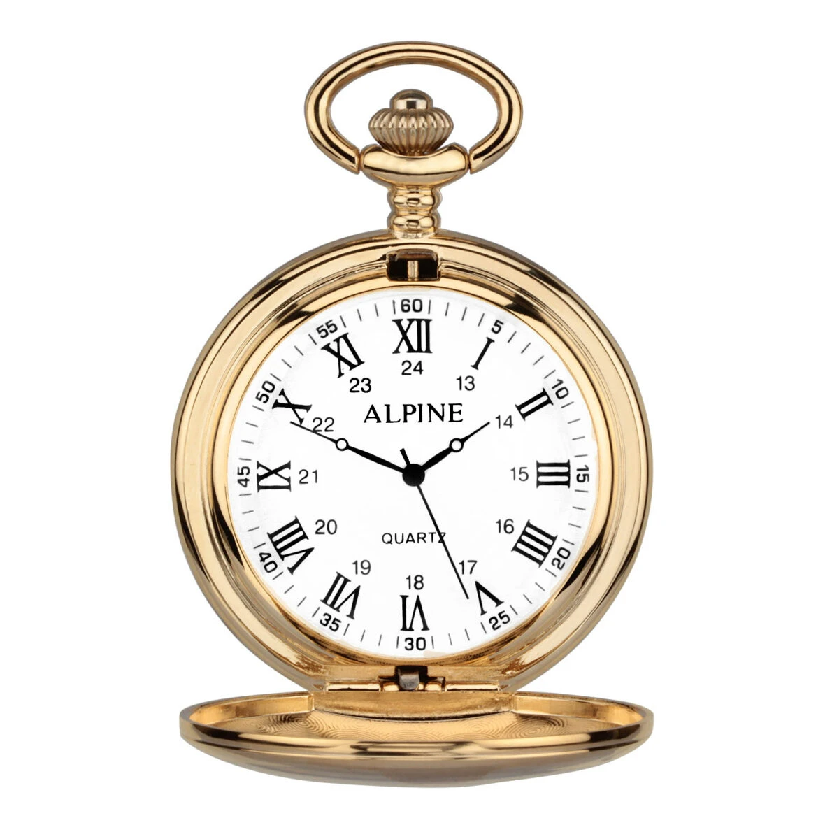 Gold coloured personalised pocket watch featuring white face and Roman numerals on dial. This classic timepiece is an elegant gift which can be personalised with up to four lines of precision engraving on the outside of the hinged lid. Every gift from Engravers Guild of London is finished to the highest standards and presented in our signature packaging.
