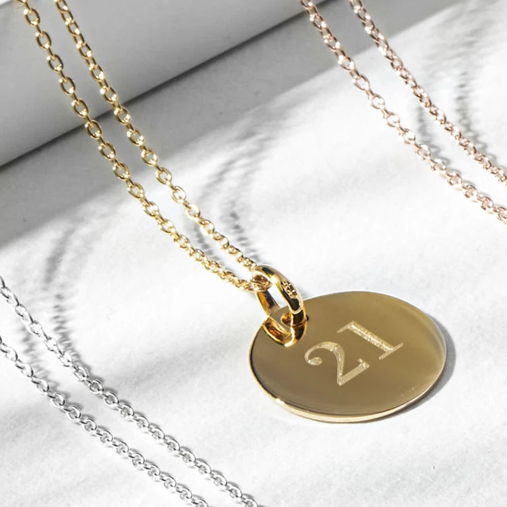 Solid 925 sterling silver personalised necklace with pendant disc, plated in deep 9ct gold. Simple in design, though exquisite in its finish, this custom necklace from MYRI London is a go-to piece in ladies’ wardrobes. The design delights with its clean lines and showcases the flawless craftsmanship to offer a remarkable piece. With a quality touch and beautiful presentation, this is a gift which will be adored for very many years.