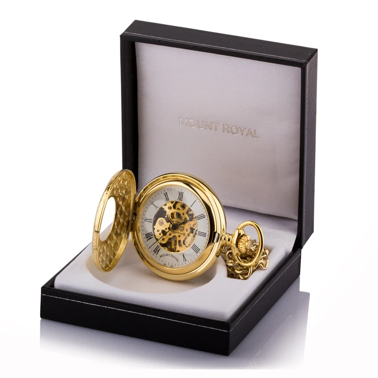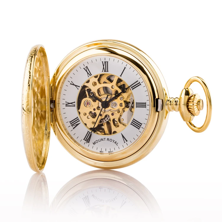 Gold plated half hunter mechanical pocket watch with skeleton case from the Mount Royal collection. This timepiece features a window in the front caseย encircled by dark roman numerals which are then embellished by a scroll design. Exterior strong lines and classic proportions offer masculine sensibilities which balance with the intricacy of the movement on display inside. Meanwhile, the traditional diamond-cut engraving brings a special and personal touch.