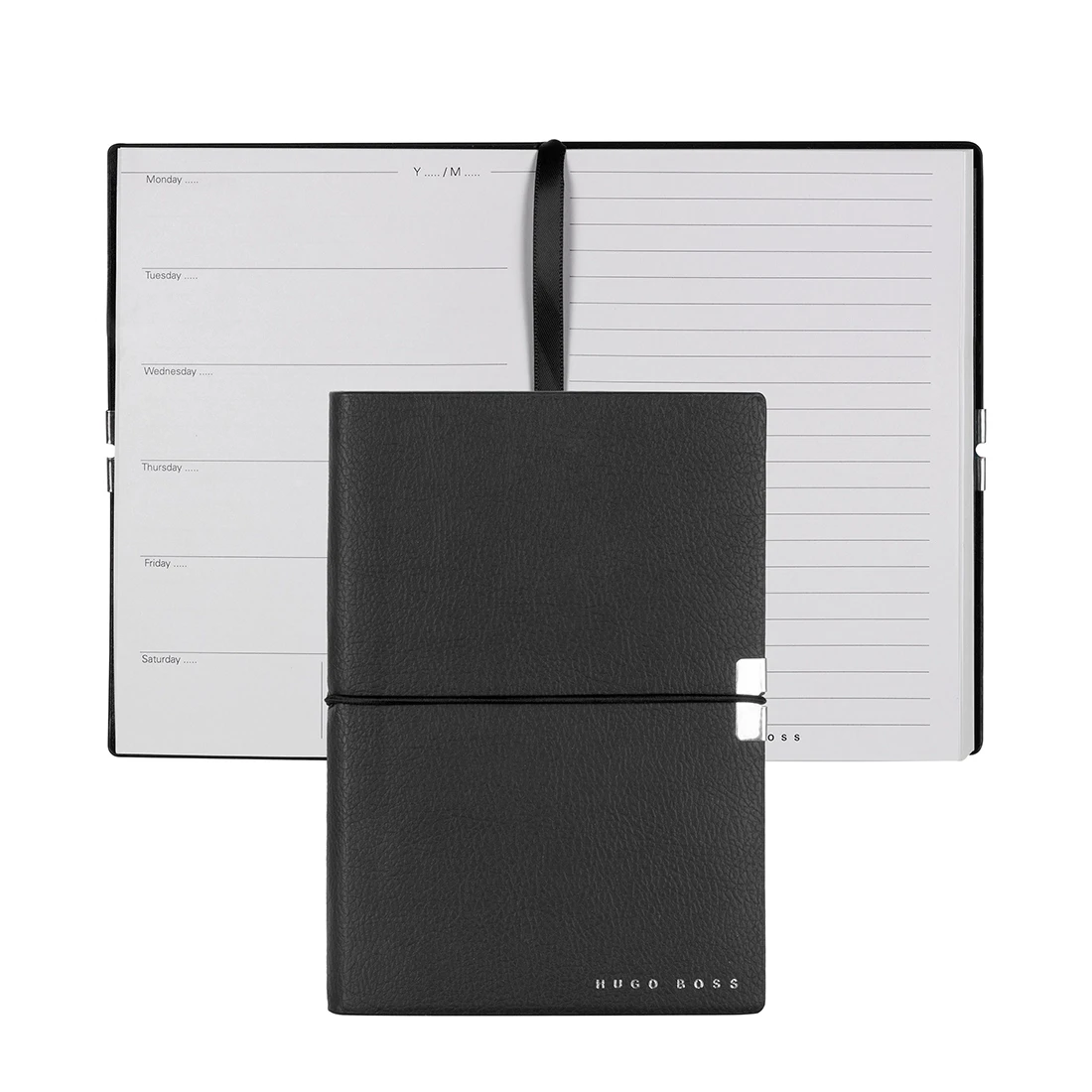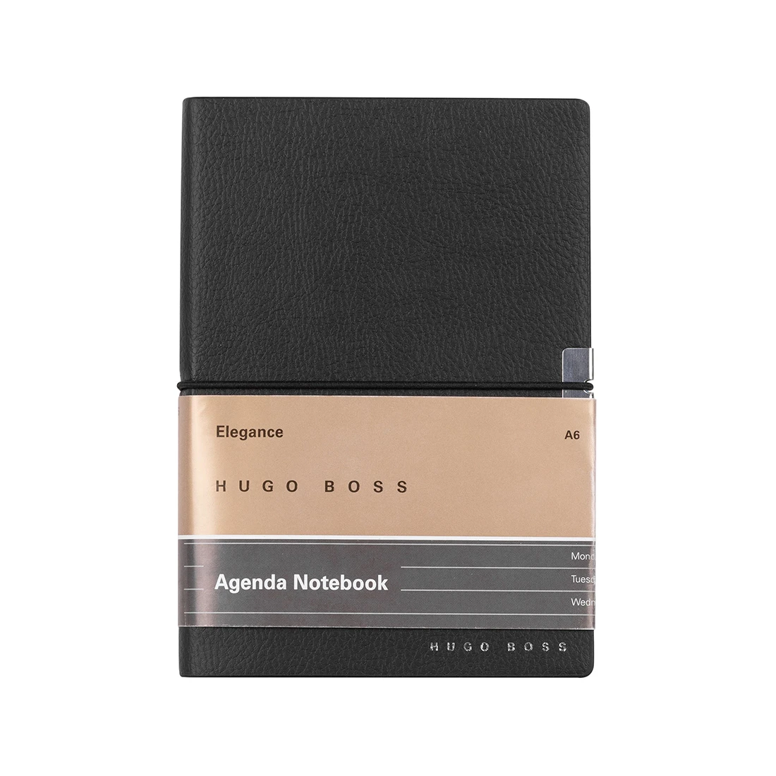 A6 black personalised notebook from the Hugo Boss Elegance Collection with agenda paper. The Elegance notebooks are outfitted with an ingenious yet minimal closure. The tonal elastic, mirroring the shade of the grained material, is secured by a chrome-plated metal trim, adding a luxurious finishing touch while also greatly improving the user experience.