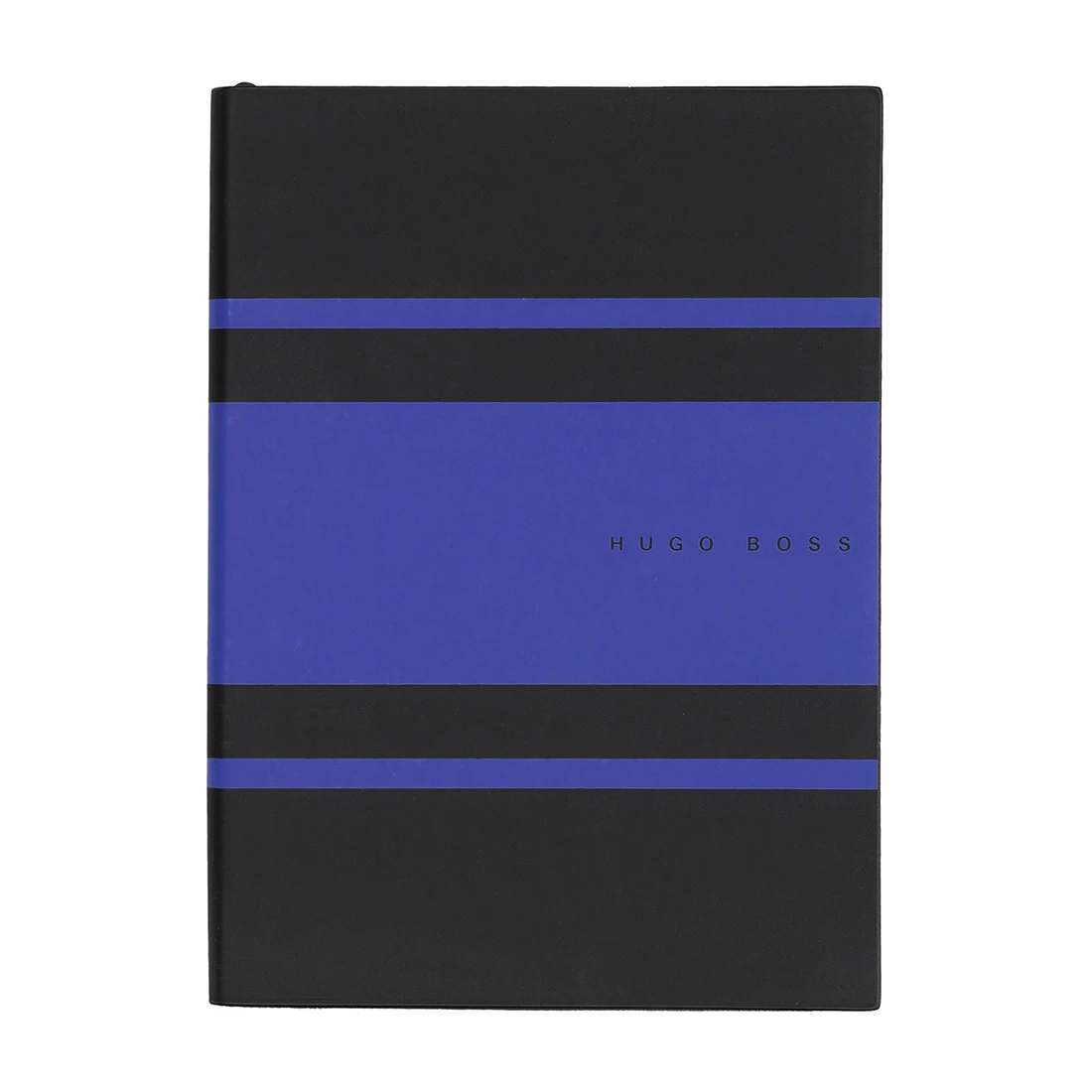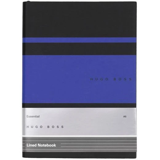 A5 blue and black personalised notebook from the Hugo Boss Essential Gear Collection with lined paper. The Essential Gear notebooks are inspired by the concept of high performance, with elements drawn from the distinctive BOSS athleisure collection. This idea is present in the innovative choice of material and the decorative stripes, which contrast blocks of colour with elegant matte black.. The Essential line is designed to bring together elegance and functionality.