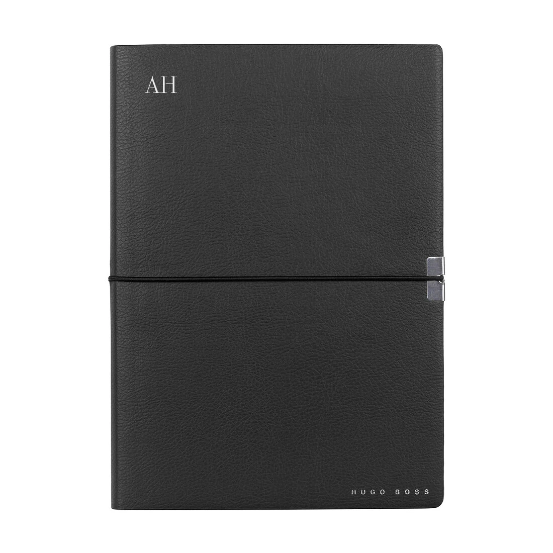 A5 black personalised notebook from the Hugo Boss Elegance Collection with lined paper. The Elegance notebooks are outfitted with an ingenious yet minimal closure. The tonal elastic, mirroring the shade of the grained material, is secured by a chrome-plated metal trim, adding a luxurious finishing touch while also greatly improving the user experience.