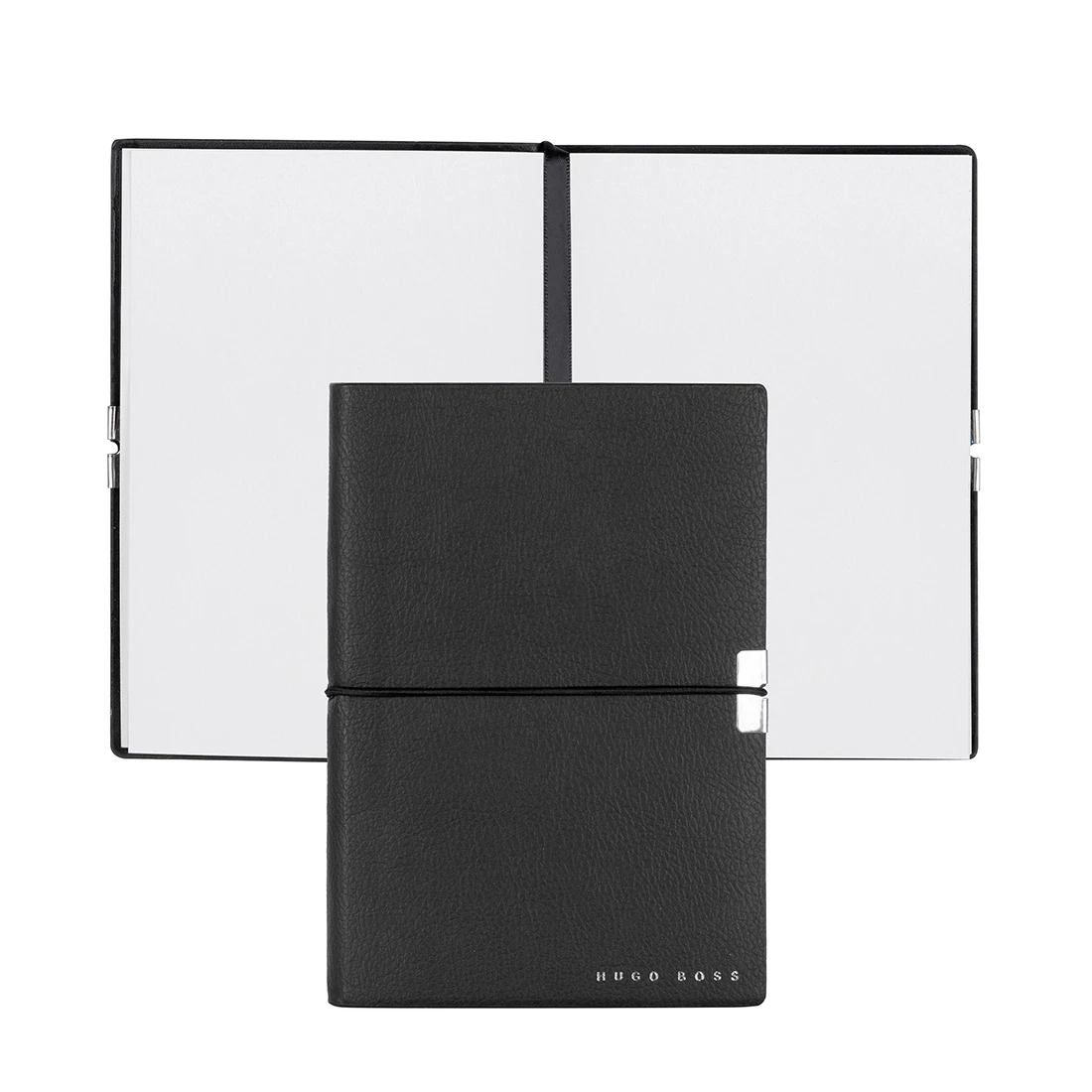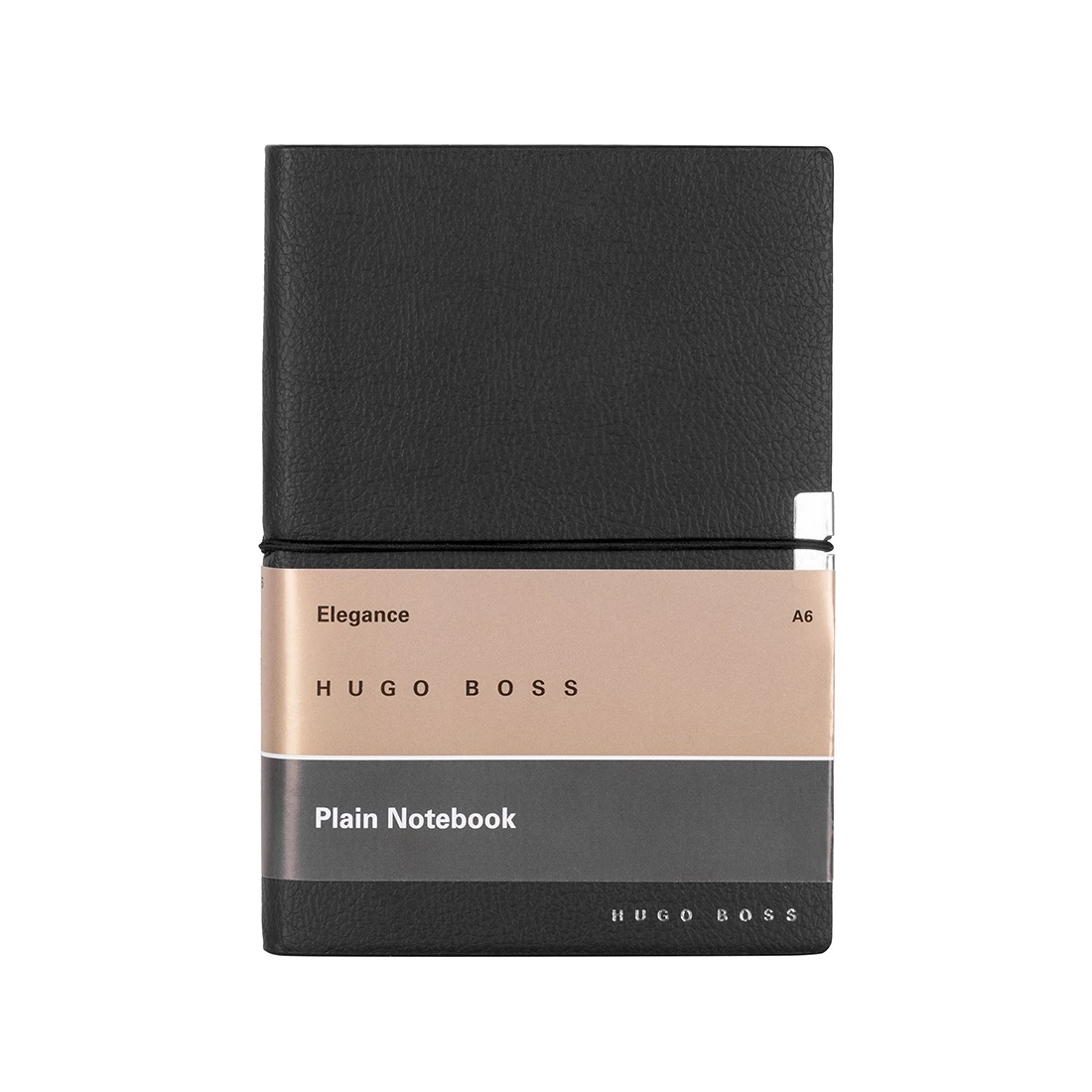 A6 black personalised notebook from the Hugo Boss Elegance Collection with plain paper. The Elegance notebooks are outfitted with an ingenious yet minimal closure. The tonal elastic, mirroring the shade of the grained material, is secured by a chrome-plated metal trim, adding a luxurious finishing touch while also greatly improving the user experience.
