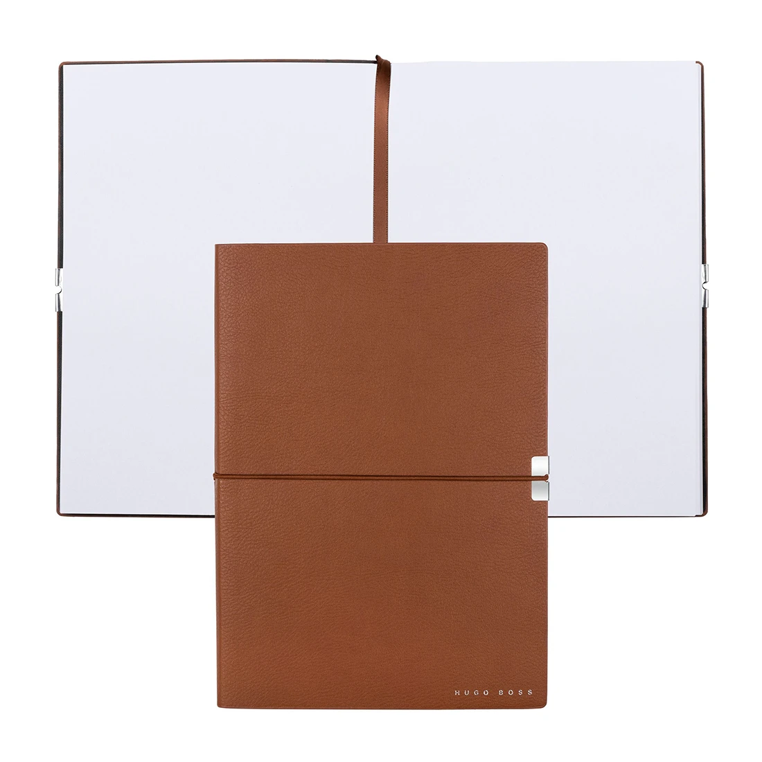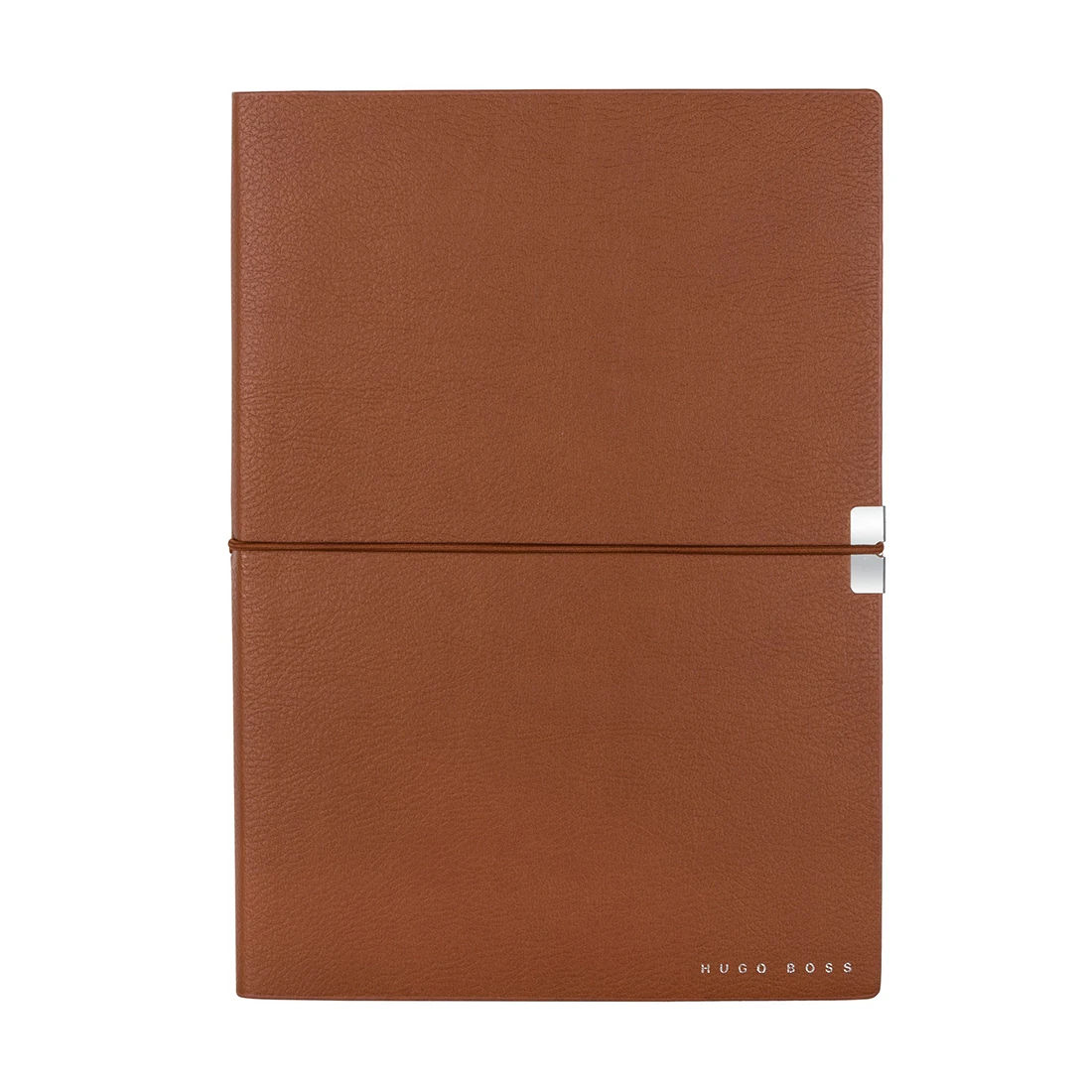 A5 brown personalised notebook from the Hugo Boss Elegance Collection with plain paper. The Elegance notebooks are outfitted with an ingenious yet minimal closure. The tonal elastic, mirroring the shade of the grained material, is secured by a chrome-plated metal trim, adding a luxurious finishing touch while also greatly improving the user experience.