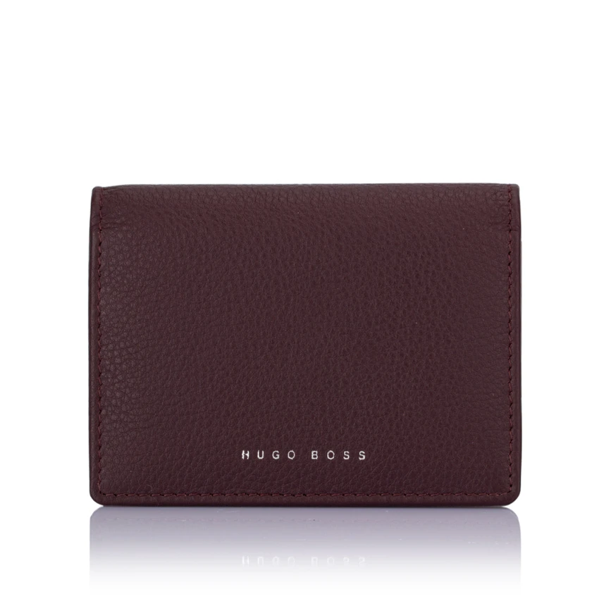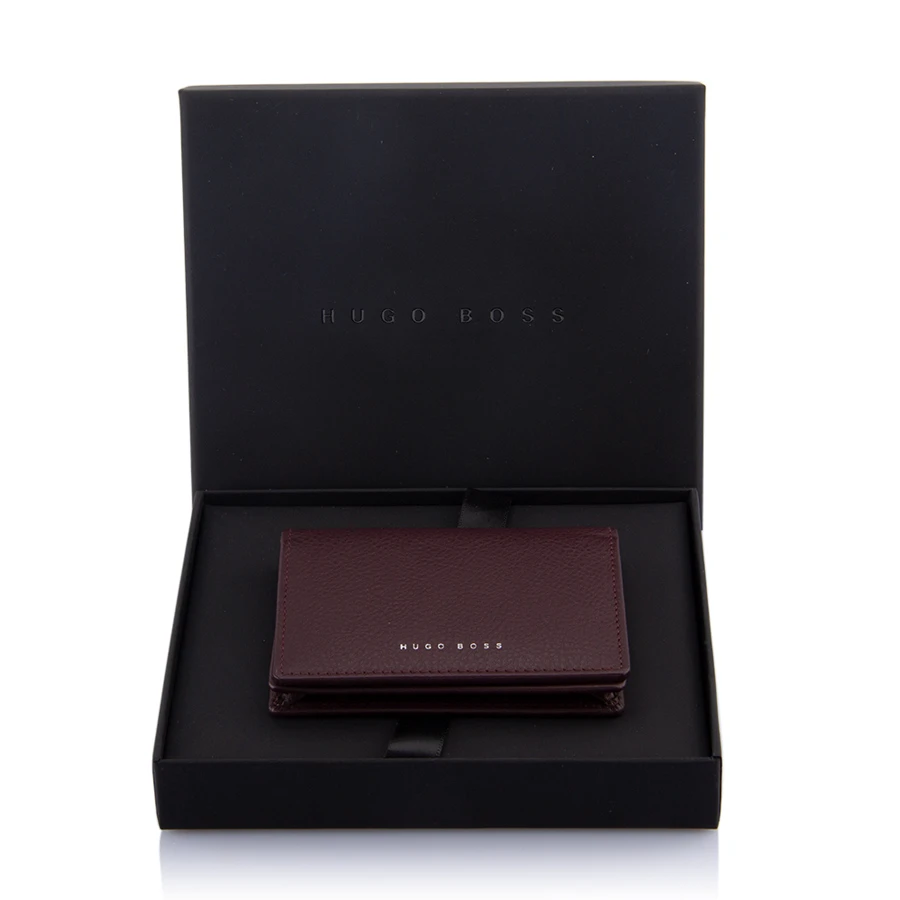 This premium Hugo Boss storyline cardholder comes in a burgundy hue and is made from refined leather. This fashionable item includes two internal compartments for cards and has been designed with functional use in mind. Personalised with gold, silver or blind embossed initials on the reverse, this custom cardholder will make the perfect gift.