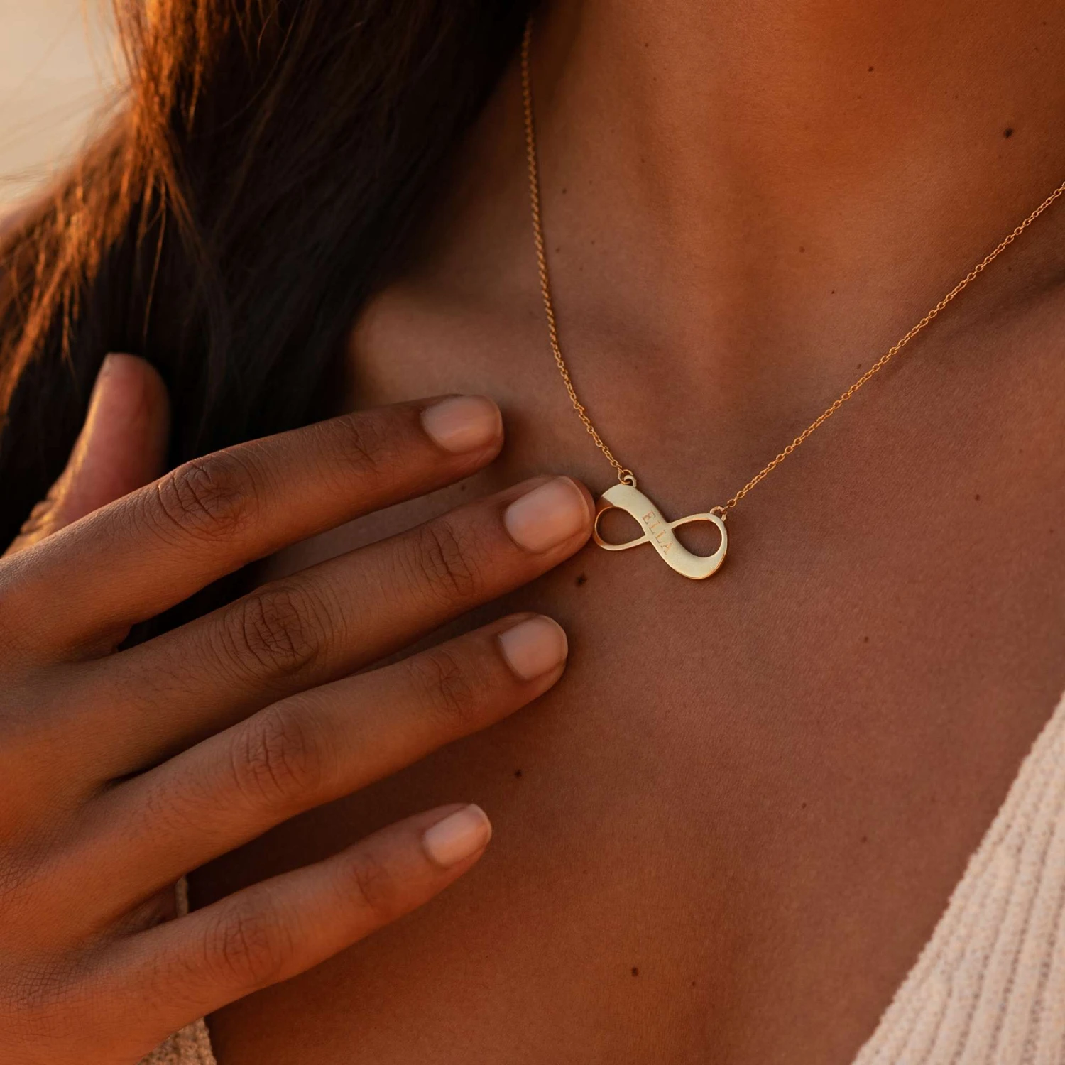 Infinity necklace in solid 925 sterling silver with 18K gold plate from MYRI London. This favourite piece in the collection represents enduring love, with the iconic symbol being redesigned to neatly accommodate a name on the central part of the ribbon. A diamond-cut engraving ensures the name will last forever. Signature packaging creates a memorable opening experience.