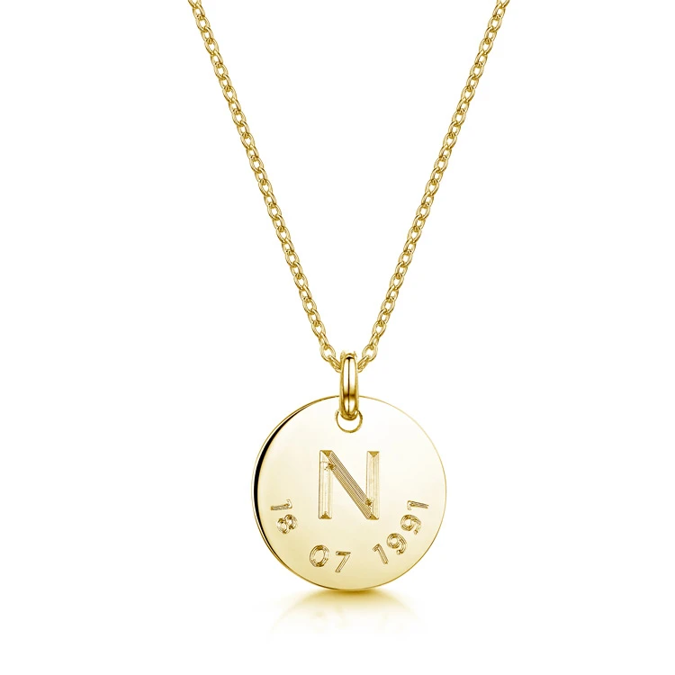 18K gold plate on solid silver disc personalised necklace from MYRI London, engraved with an initial and date. The unique design layout beautifully and neatly records a significant date, inscribing the day permanently in stunning gold plated on solid sterling silver. A staple in any jewellery box, the disc personalised necklace delights in its simplicity and is an enduring favourite in the collection. Perfect for layering or for wearing on its own, the gold disc engraved necklace is finished with precision diamond-tipped cutters, creating an impression that will last with lustre for very many years.