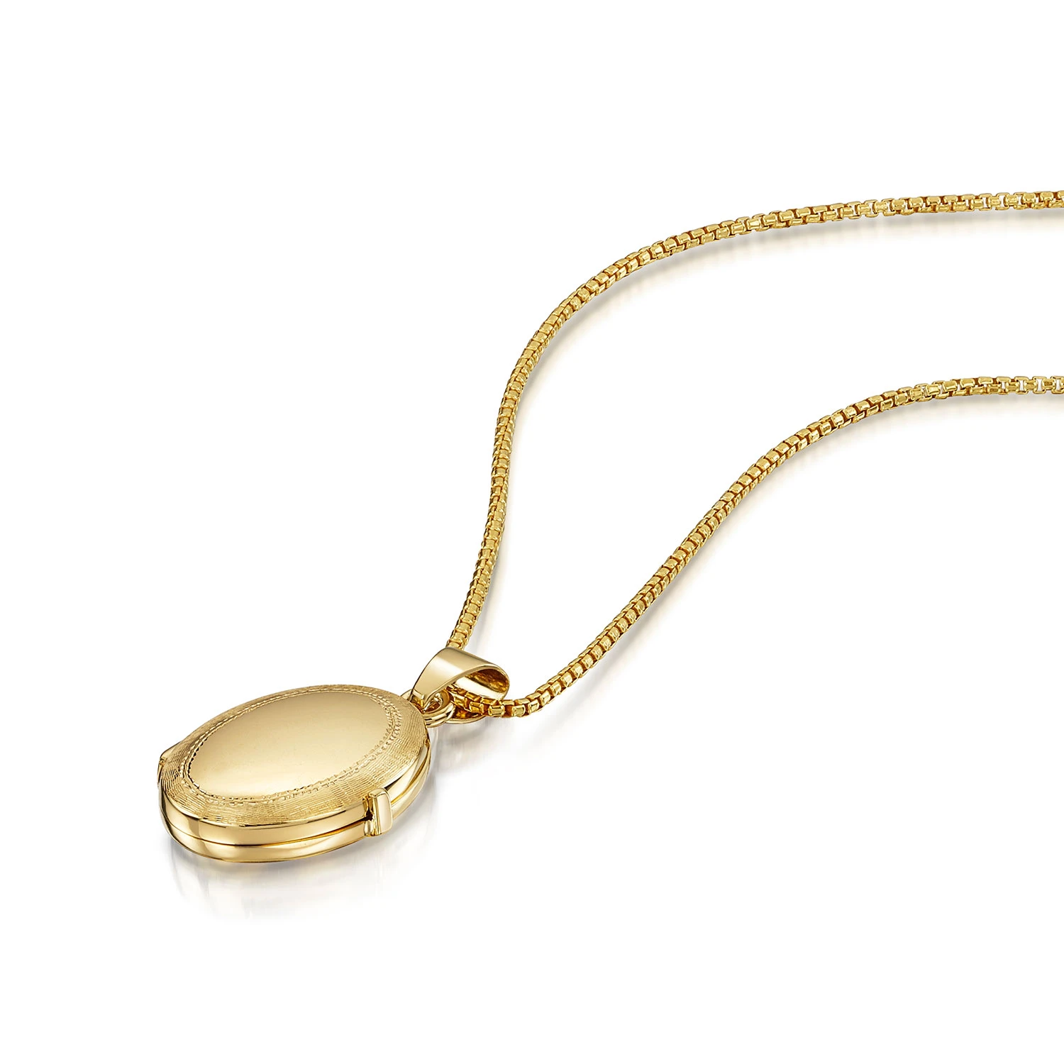 Gold plated 925 sterling silver oval locket made in Italy. Italian jewellers are known for their exquisite craftsmanship and timeless beauty, this locket is then personalised by Engravers Guild of London. This perfectly poised piece showcases a modern border design engraved onto the front of the locket. The locket is beautifully finished and expertly engraved for a very special gift experience.