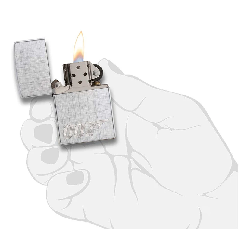 James Bond Zippo lighter with 007 graphic displayed on front. Evoking the spirit of Her Majesty’s secret agent, this rare windproof lighter honours the attitude created by Sean Connery and Timothy Dalton in their respective portrayals of the international spy. The engraved lighter features flint action spark wheel and boasts Zippo’s innovative engineering capabilities which guarantee a piece of premium quality and lasting durability. The engraving is made with a diamond-tipped machine cutter to achieve an elegant and enduring impression.