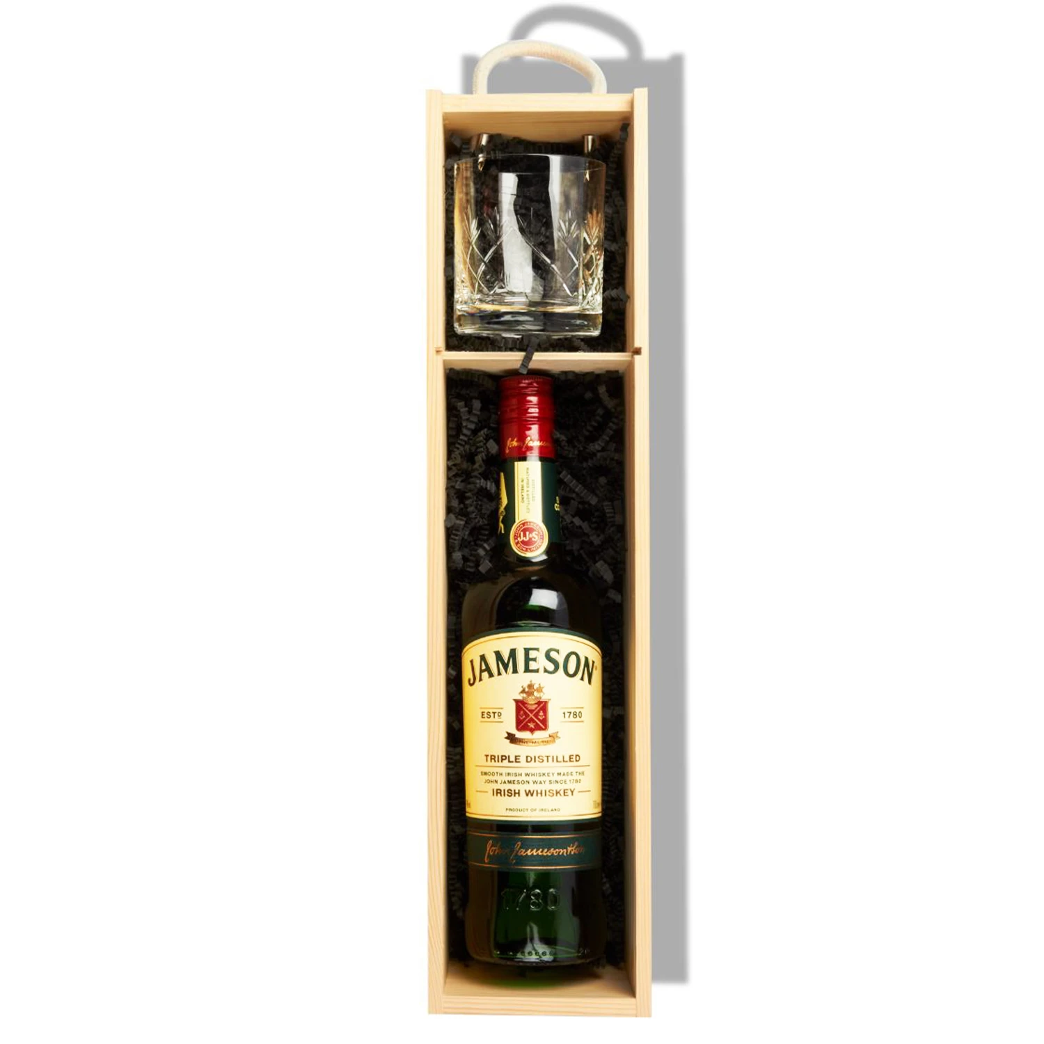 Create a cherished keepsake for the discerning whisky connoisseur by gifting a Jameson Irish Whisky Bottle presented in a luxurious wooden box and a whisky glass engraved with a message of your choice. A unique whisky with a perfect balance of spicy, nutty and vanilla notes with hints of sweet sherry. Simply enjoy neat, poured over ice, or in any of your favourite whisky cocktails.