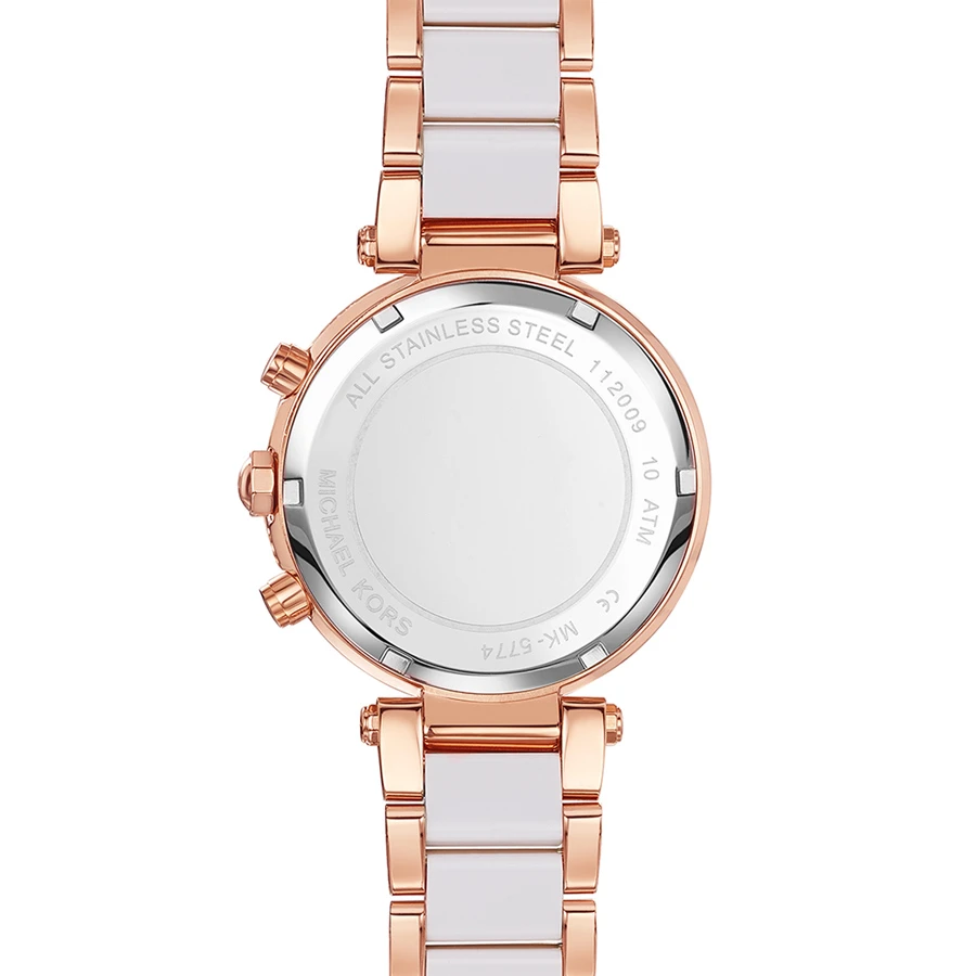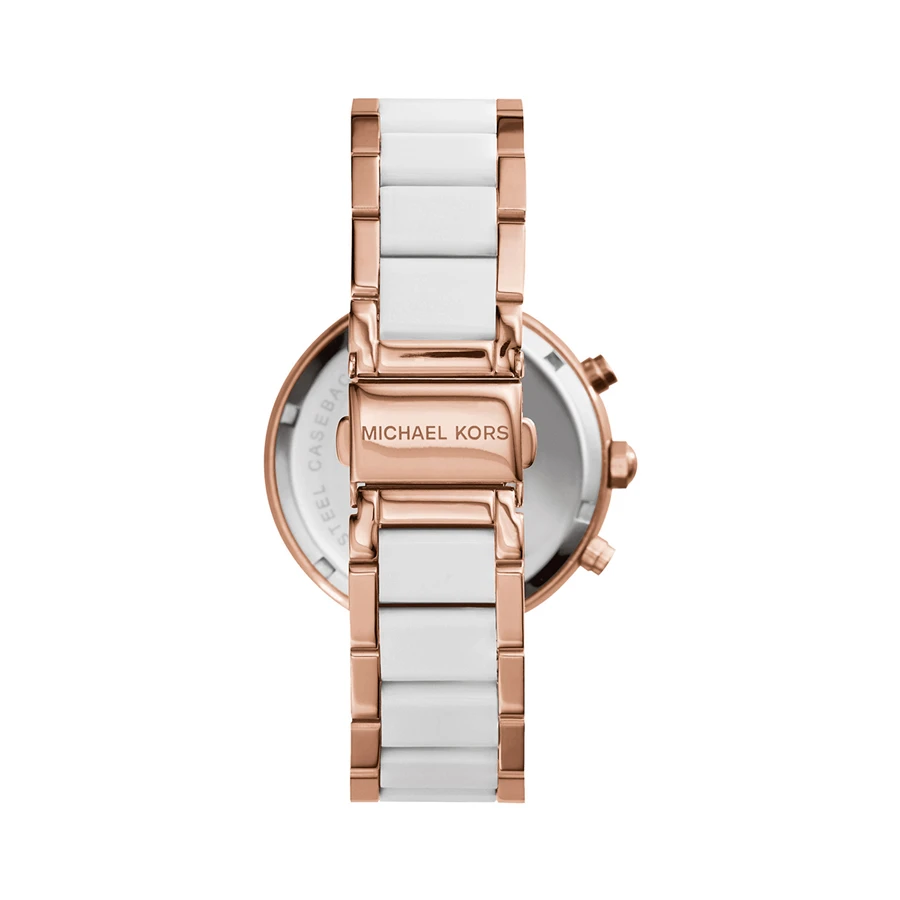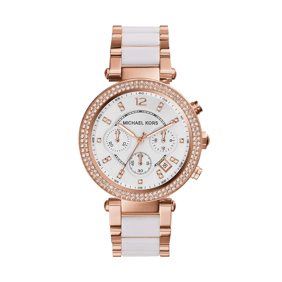 Rose gold chronograph engraved ladies watch with stone set bezel. This contemporary timepiece epitomises the signature style of Michael Kors, combining strong lines with delicate detail. Brilliant diamantes bring glint at the hour markers and around the case, perfectly balanced by an elegant two-tone bracelet strap. The watch is expertly engraved on the reverse of the case with traditional diamond-tipped cutters for crisp and enduring impression.