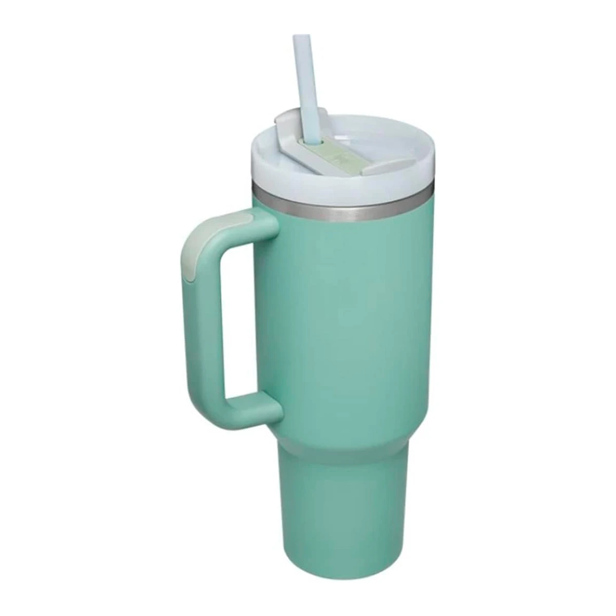 Personalised 40oz travel mug. This 40oz Double Walled Travel Cup in contemporary aqua green, the ultimate hydration solution for the modern adventurer. With a generous capacity, double-walled insulation, and a convenient handle plus straw and 3 position lid, it’s perfect for any journey, keeping your beverages at the ideal temperature while ensuring a spill-free experience. Elevate your style with laser-engraved personalization options, making it uniquely yours.