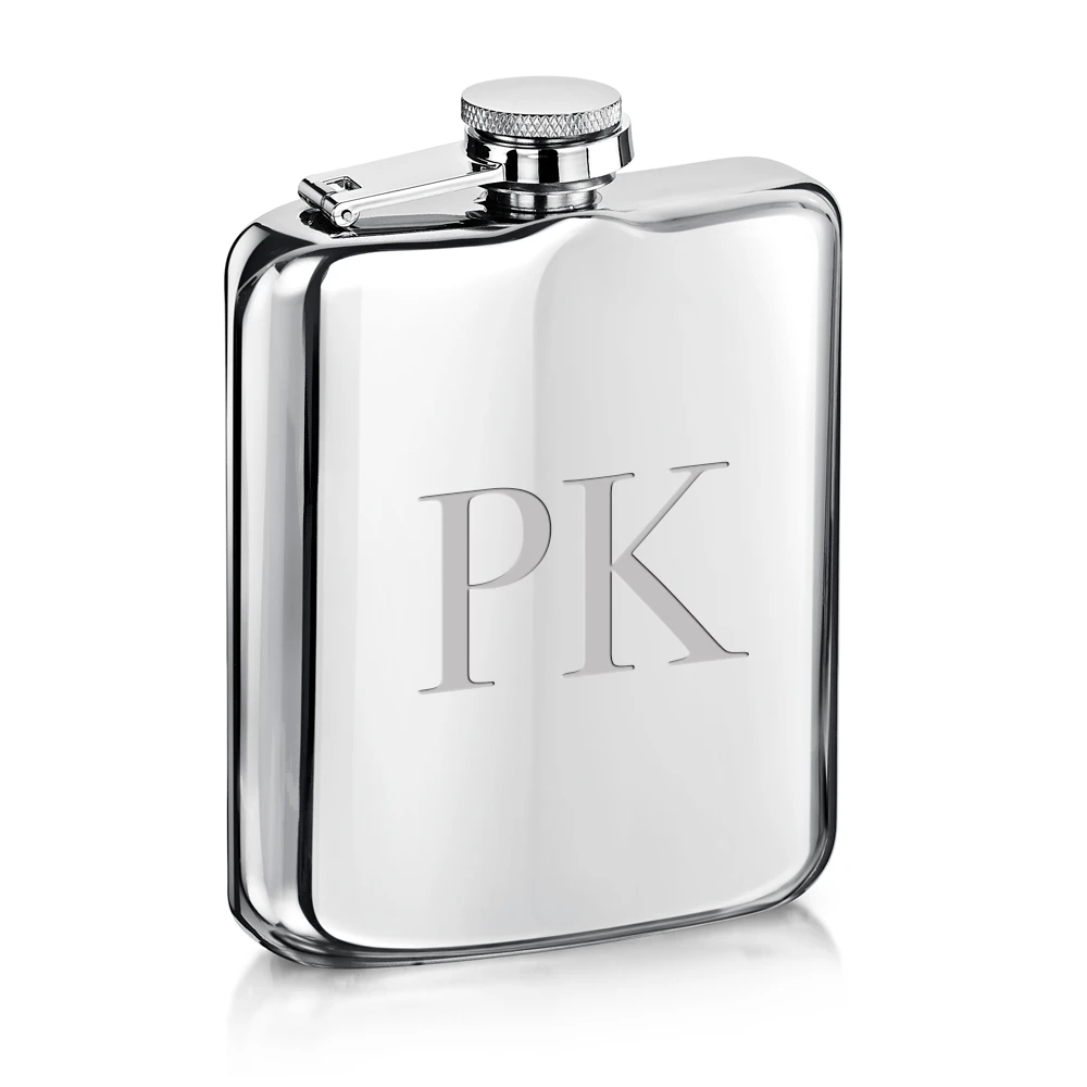 A very special stainless steel 6oz hip flask gift set, featuring graphic large initials. The substantial pocket hip flask boasts a wonderful quality, with rounded edges and a high grade polish and buff to create a brilliant shine. The reflective surface is the perfect stage for a custom engraving to make a perfect gift.