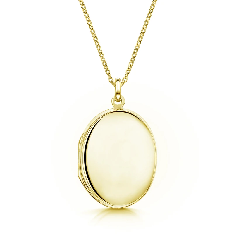 Large oval locket made in solid 925 sterling silver and plated with gold. This truly exquisite item seamlessly incorporates the flow of the hinge into the body of the locket, and the interior has space for a sizeable photo within each side. With the engraving made with the highest quality diamond-tipped cutters, receiving the engraved gift makes for a very special moment.